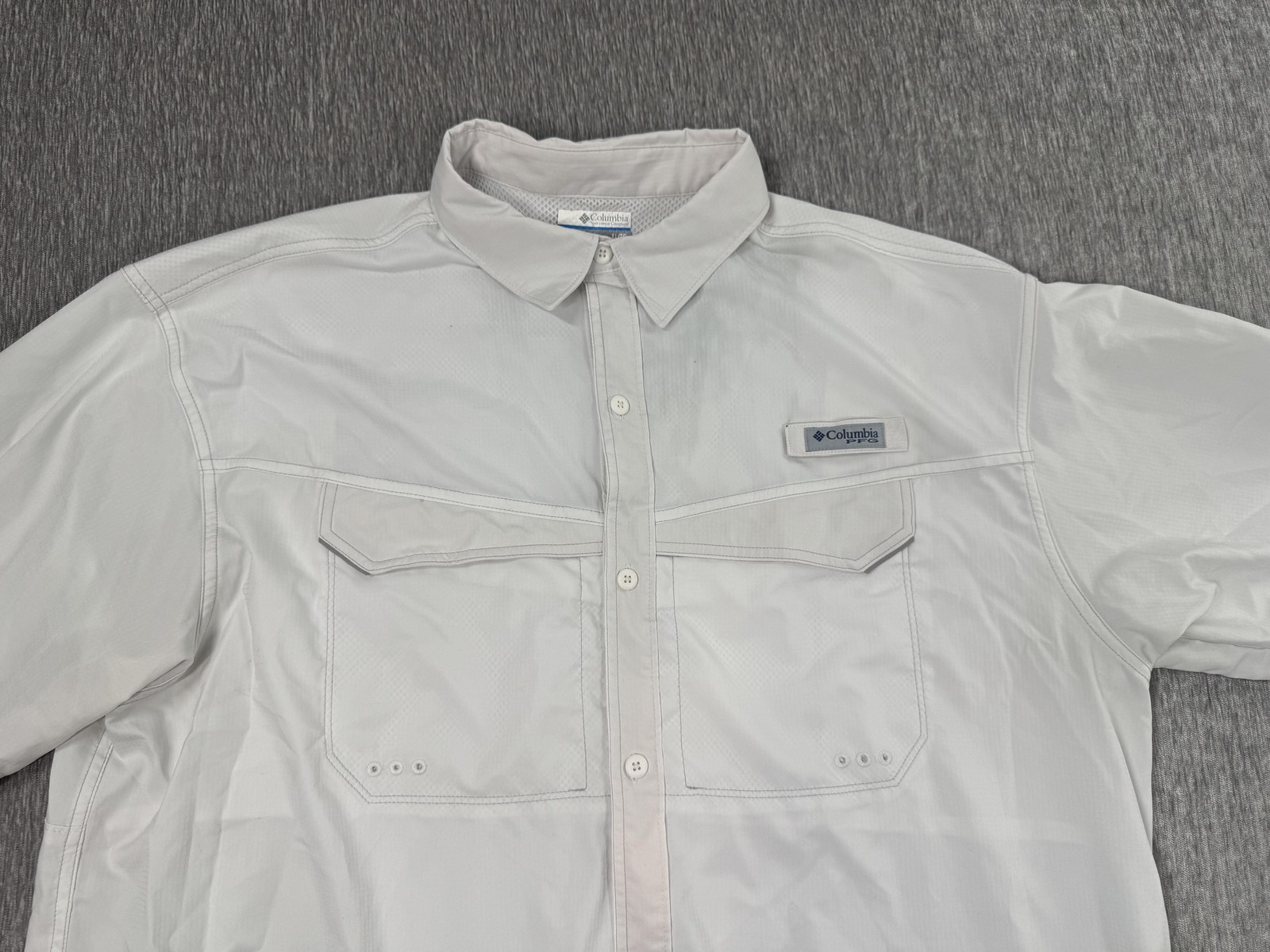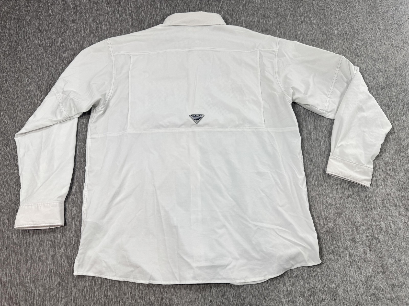 Branding: Columbia logo patch at chest; PFG triangular patch at upper back
