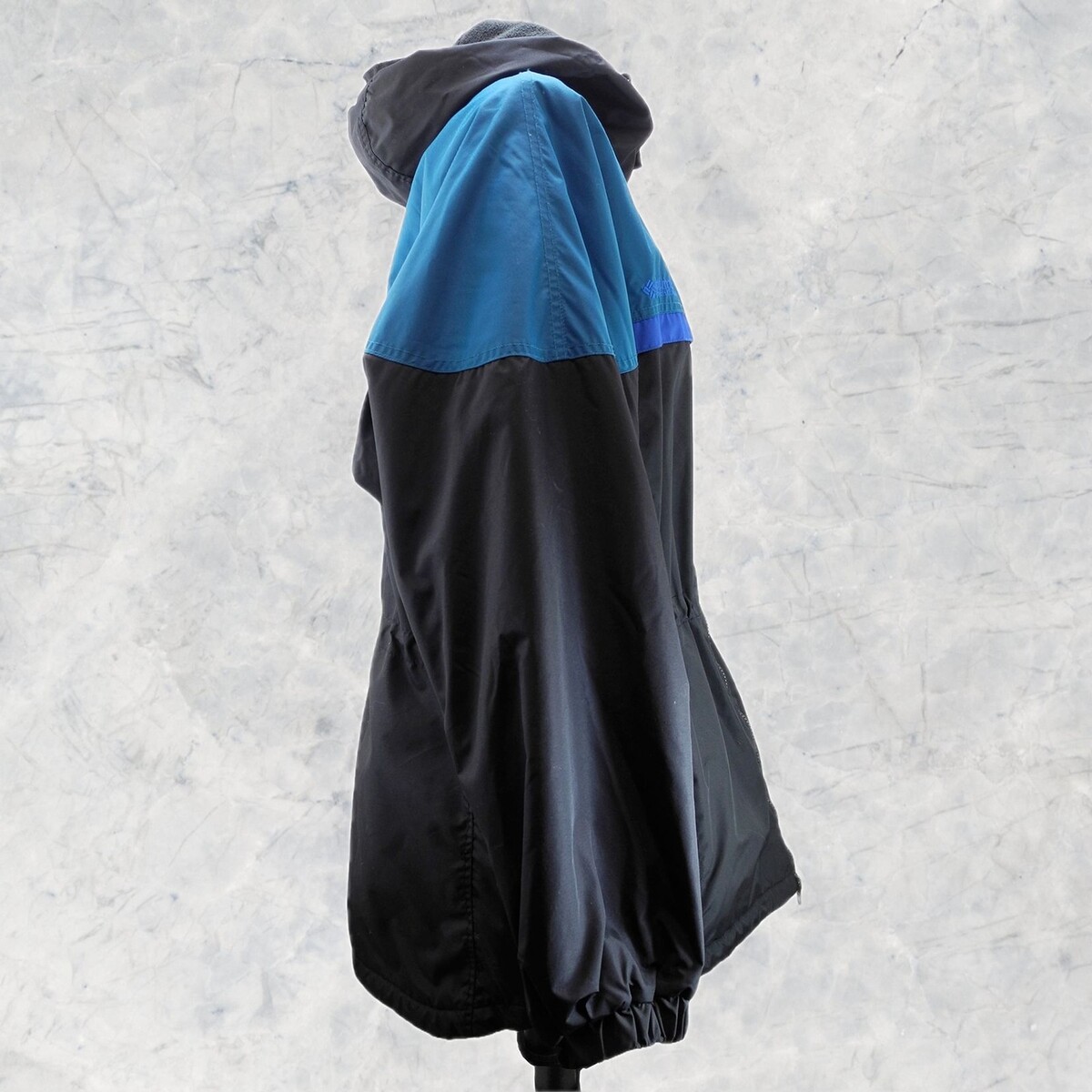 Columbia Sportswear women's size Medium coat. Black, teal and blue fleece lined with full zipper front. Two hand pockets with zip closures. Adjustable drawstring at the waist, inside pocket with zip closure. Long sleeves with elasticized cuffs. Hood is attached and has adjustable drawstring. Very good condition with light wear/pilling to the interior fleece lining. Shell and Lining: 100% Nylon, Insulation: 100% Polyester; Machine Wash.
