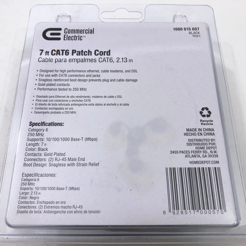 - Commercial Electric 7 ft CAT6 Patch Cord Black - 1000 015 607 NEW