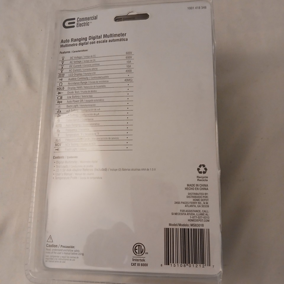 - Commercial Electric Auto Ranging MultimeterBattery Operated-(2) AAA Batteries