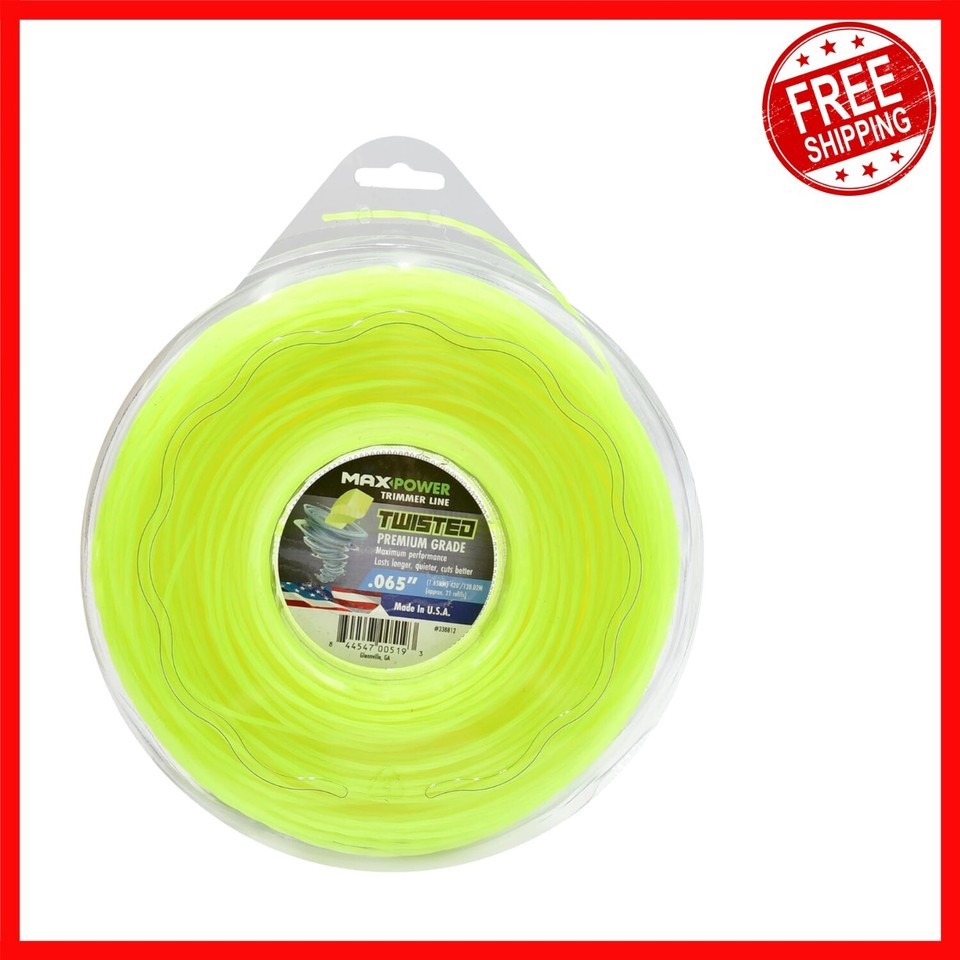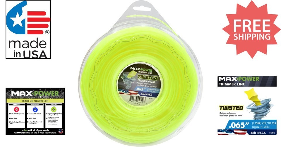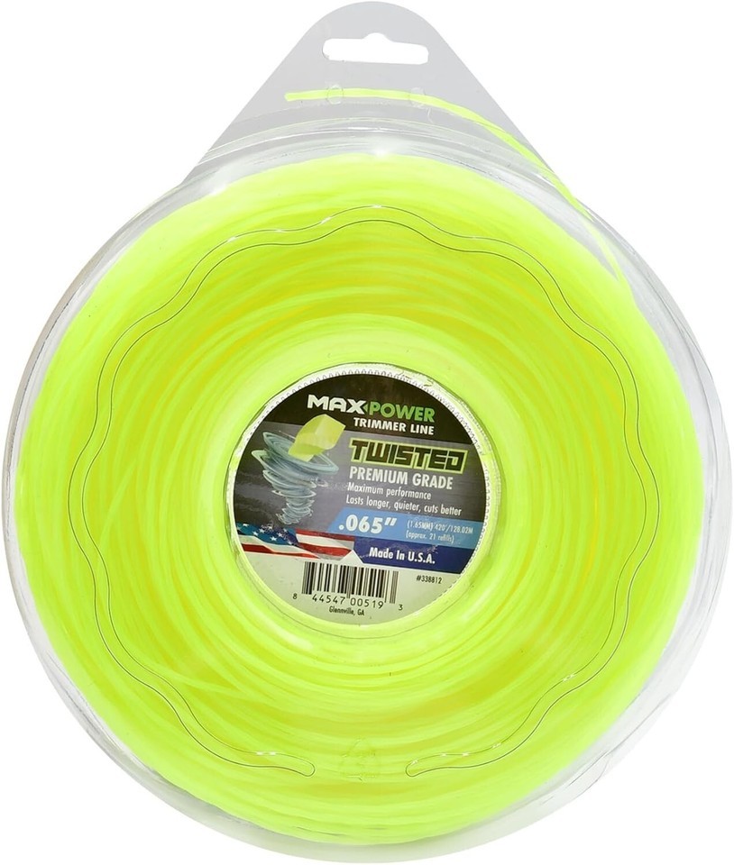 MaxPower's twisted trimmer line is designed for maximum performance and durability. Made from commercial-grade co-polymer resins in the USA, this high-quality line measures 0.065 inches in diameter and comes in a vibrant optic yellow color, making it easy to see during operation. Each pack includes 21 refills, providing long-lasting use. Engineered for quiet operation, enhanced cutting power, and reduced equipment vibration, this trimmer line ensures efficient, clean cuts with less noise and less line drag. Perfect for professional and heavy-duty use.