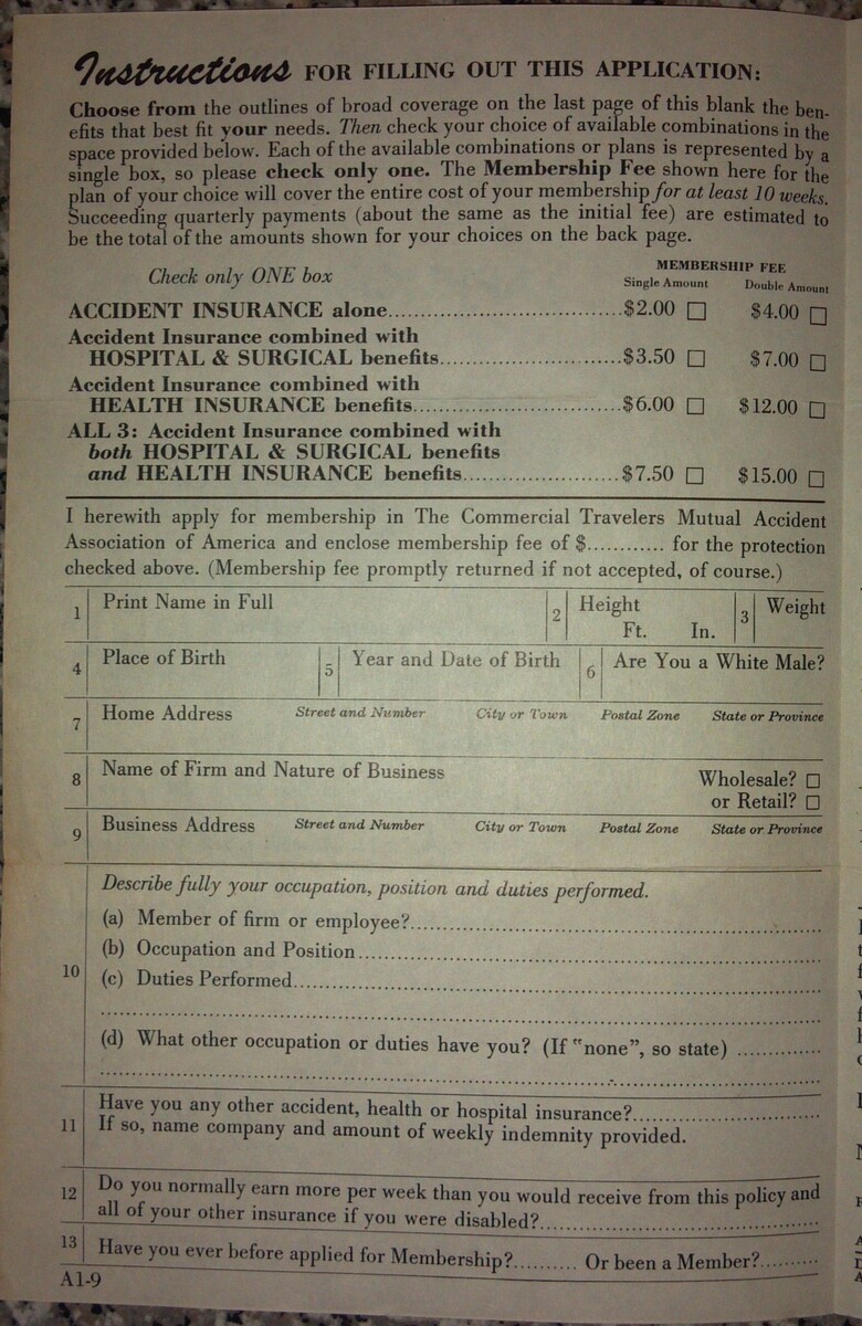 - Commercial Travelers Mutual Accident Association of America 1950 Insurance Form