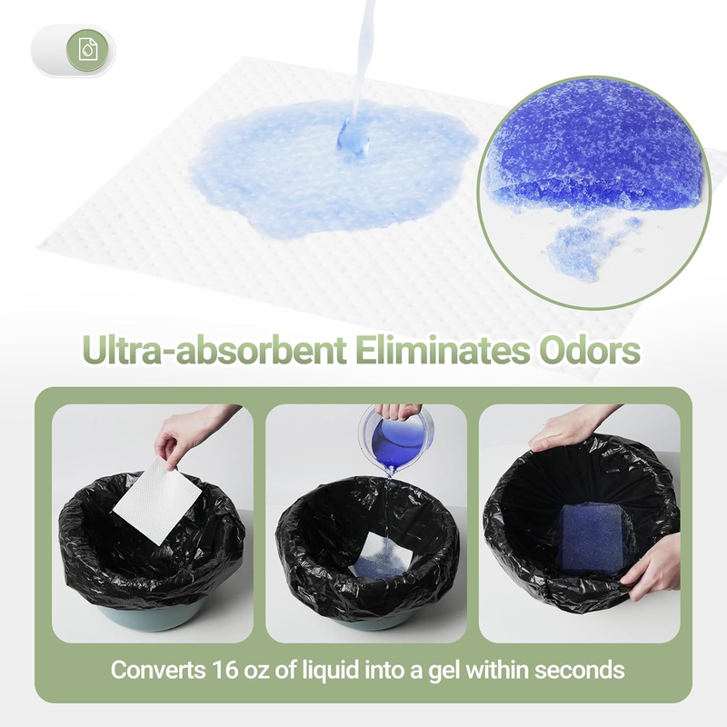 ?Powerful Absorption?: Commode absorbent pads doesn't just absorb, it performs magic! Capable of soaking up to 35 ounces of liquid, witnessing them swiftly turn urine into gel will leave you amazed. Moreover, it's not just about reducing odors; it also creates a fresh and comfortable home environment for you