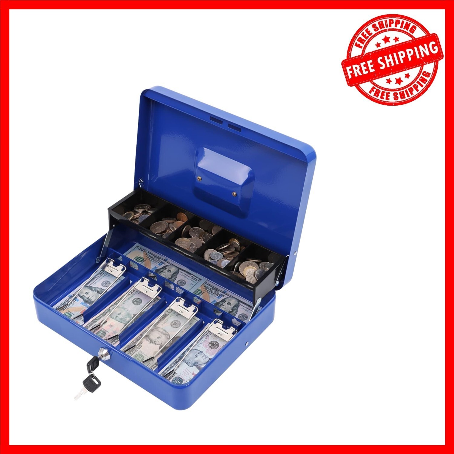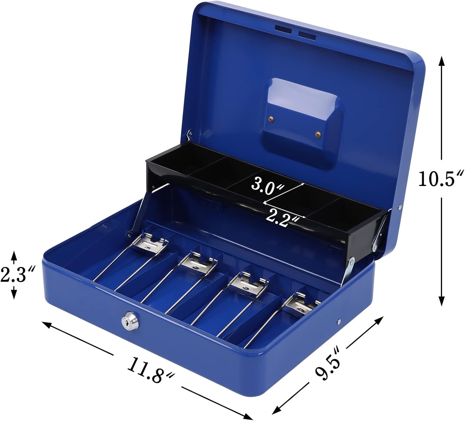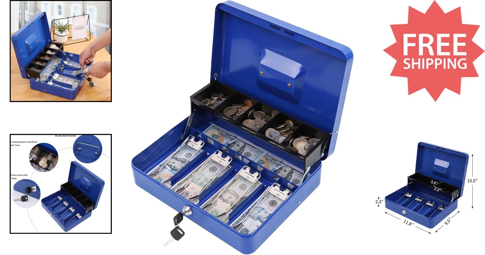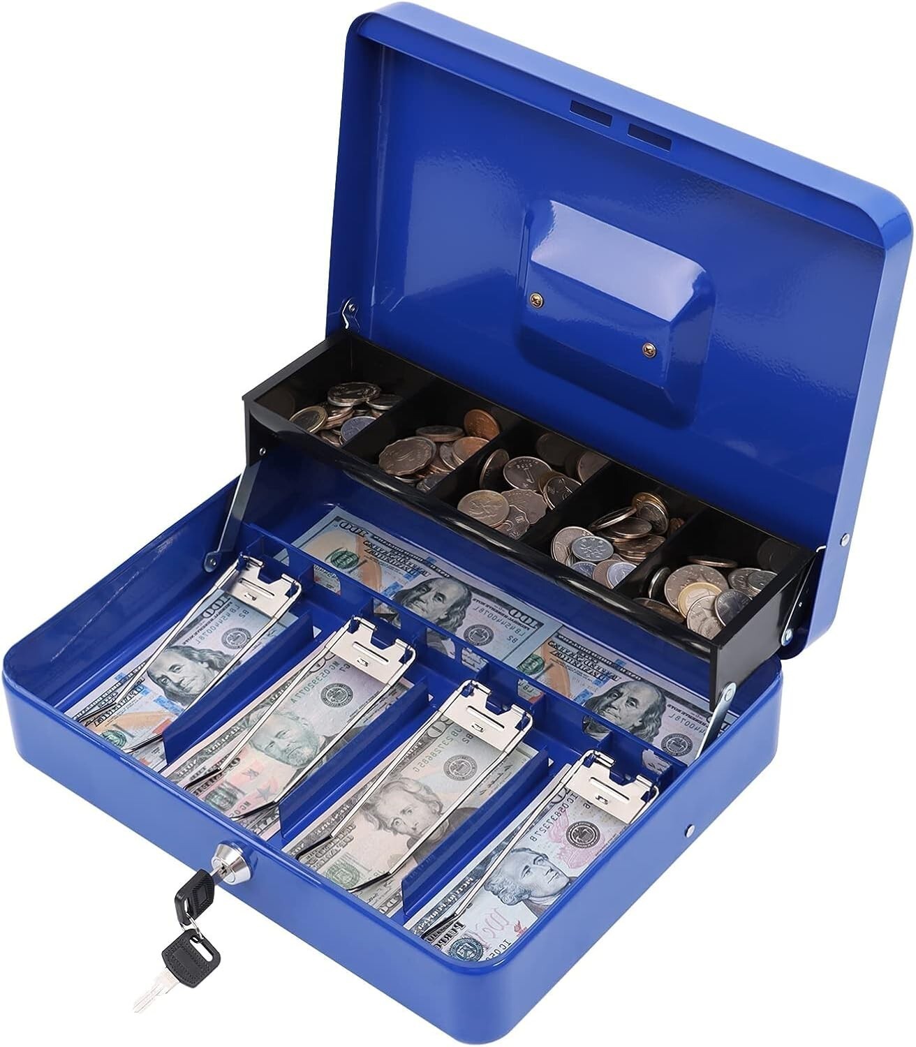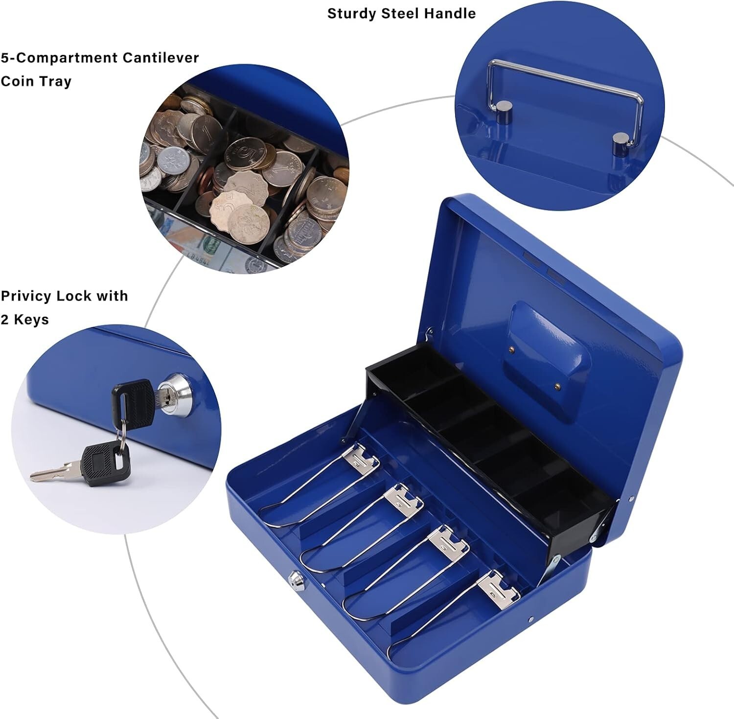 Features: Includes Lock Key,Lockable,Portable,Durable steel construction,Rounded corners,Lightweight design,Sturdy handle,Tiered tray design,Cantilever coin tray,Five-compartment coin tray,Four spring clips,Keeps bills organized,Privacy lock,Two keys included,Suitable for various occasions