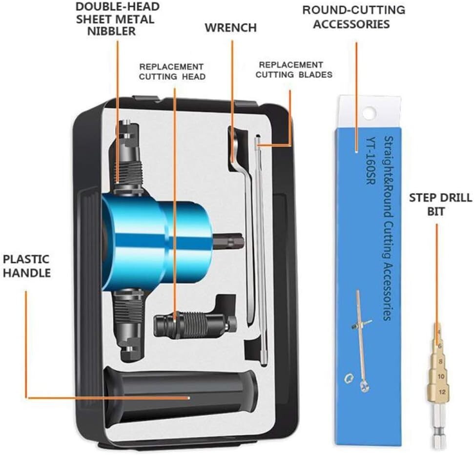 Features: Case Included,Double head,Metal sheet nibbler cutter,Circle cutting accessories,Drill attachment,Wrench included,Can cut 14 gauge steel,Cuts up to 2mm thick,Precision cutting,Burr free edge,Cuts in any direction,Follows complex profiles,360-degree movement,Straight cutting,Gutter cutting,Roof sections cutting,Complex shapes cutting,Stencils cutting,Includes 2-