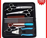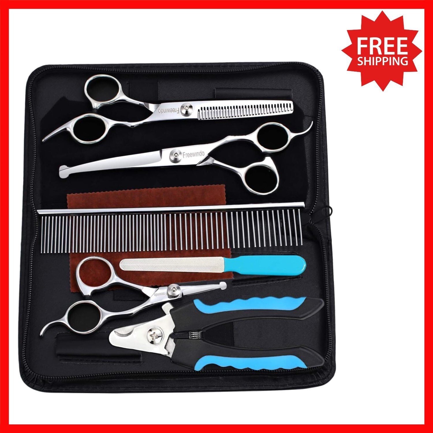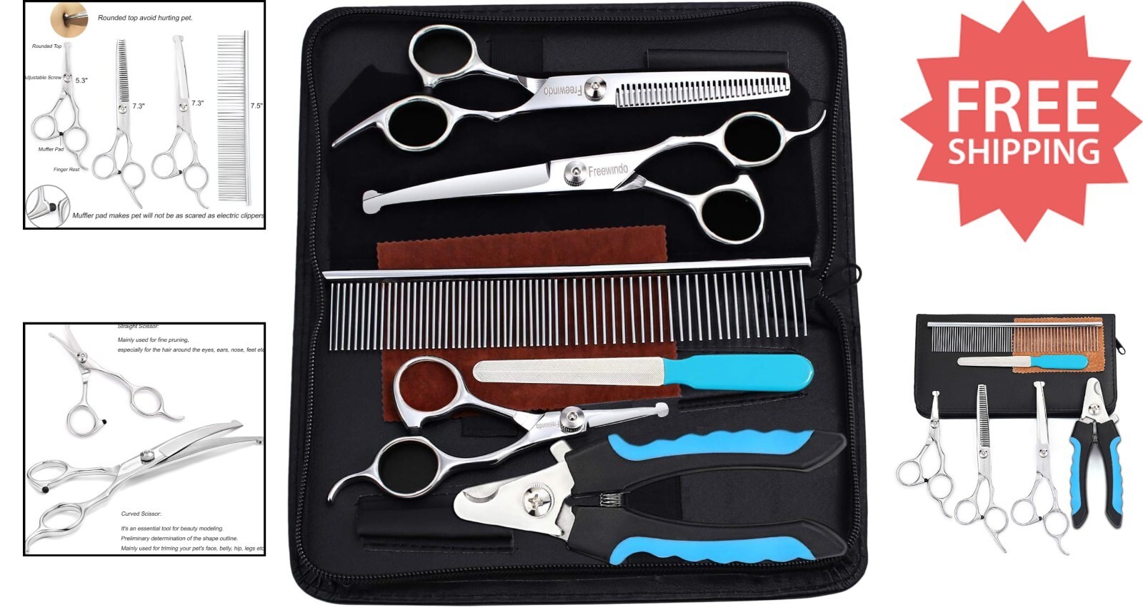 This comprehensive dog grooming scissors kit includes everything you need to keep your pet looking its best. It features 7.3'' thinning and curved scissors, a 5.3'' straight scissors, a pet comb, nail clippers with a protective guard, a nail file, cleaning cloth, and a sleek black leather case. Designed with safety and durability in mind, all scissors have rounded tips for safe trimming around sensitive areas, while the heavy-duty stainless steel blades ensure long-lasting sharpness. An ergonomic design with rubber padded handles reduces hand fatigue, making grooming comfortable and safe. Save time and money by grooming your pet at home with this all-in-one professional-quality set.