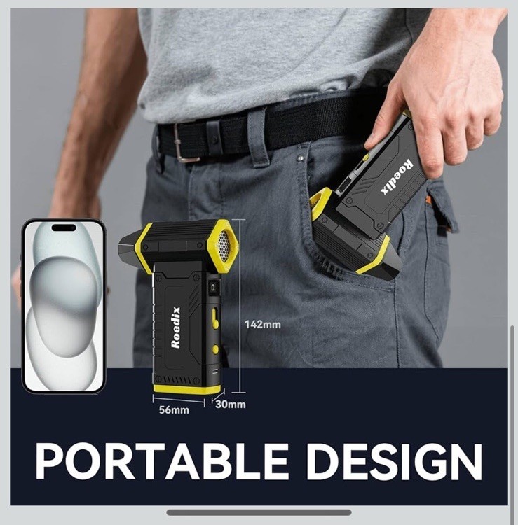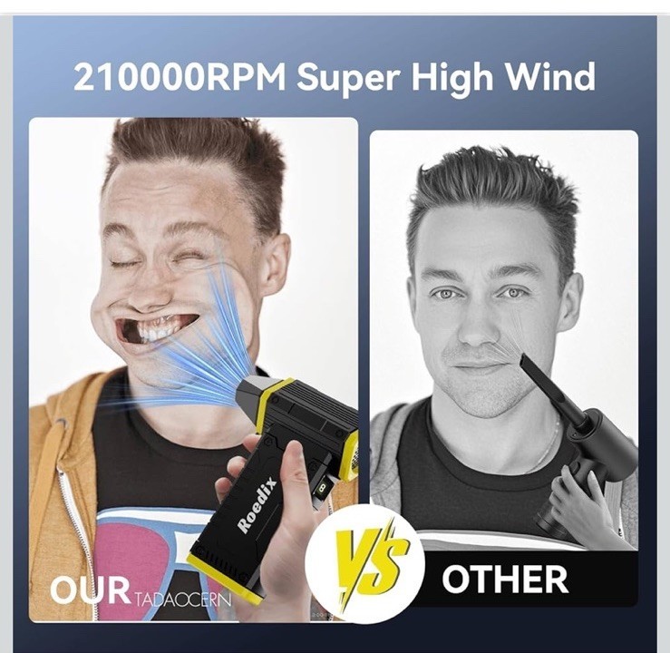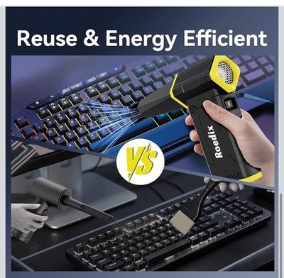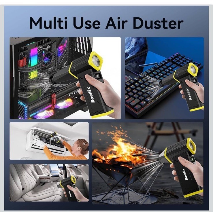 The Roedix Compressed Air Duster is a versatile cleaning tool that operates at 210,000 RPM with 8 adjustable gears, making it ideal for removing dust and debris from electronics and surfaces. The yellow electric air duster comes with a blower brush and is suitable for all-purpose cleaning needs. This convenient and powerful tool helps keep your devices and workspace clean and tidy with ease.