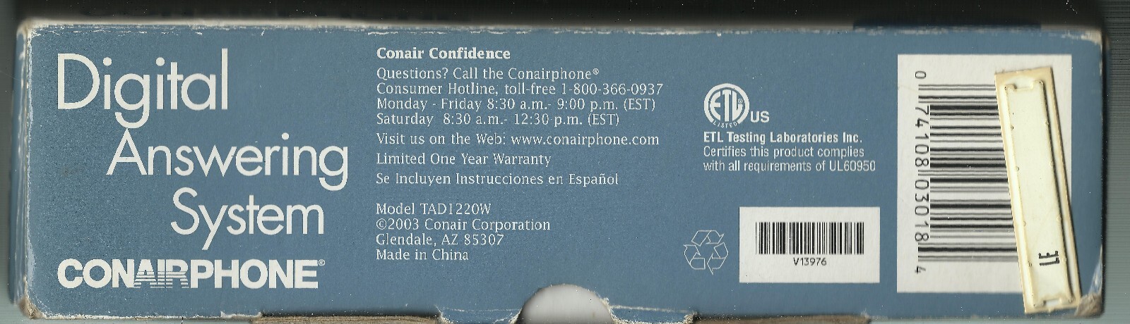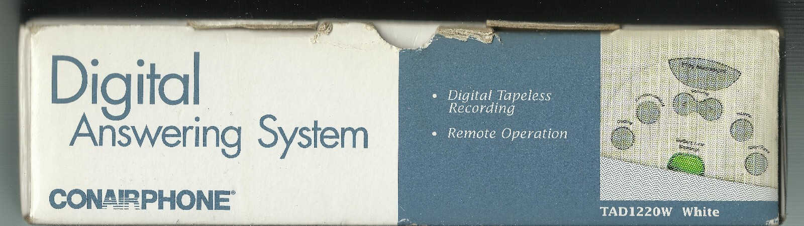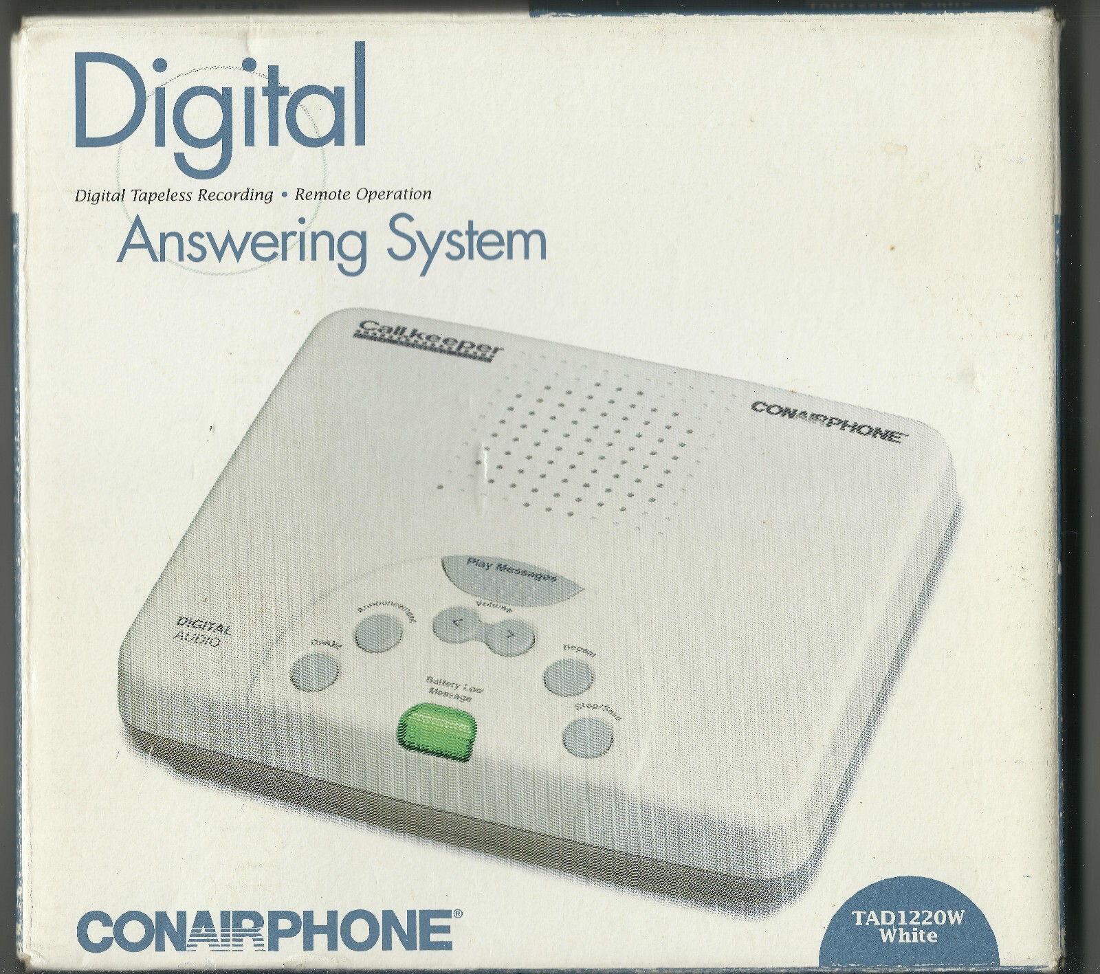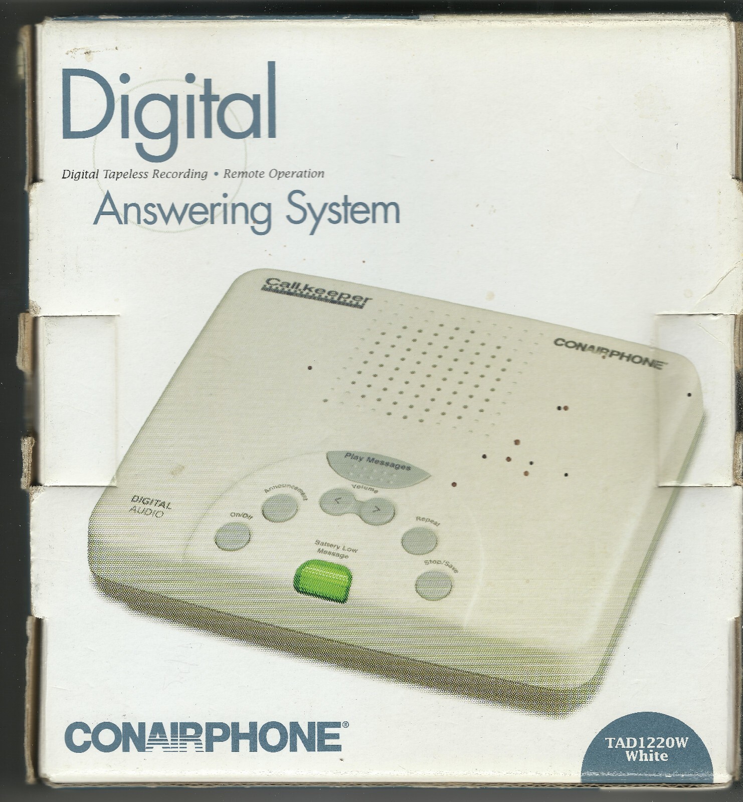 (1) NEW CONAIRPHONE brand DIGITAL ANSWERING MACHINE MANUFACTURED BY CONAIR CORPORATION MPN TAD1220W (white) UPC# 074108030184. THIS DIGITAL ANSWERING SYSTEM FROM CONAIR IS NEW IN TATTERED BOX AND STILL MAINTAINS A VINTAGE APPEAL FOR LANDLINE TELEPHONE USERS. USES TAPELESS RECORDING TECHNOLOGY SO NO NEED FOR CASSETTE OR TRADITIONAL MAGNETIC TAPE. REMOTE OPERATION, ALLOWING USER TO ACCESS AND MANAGE MESSAGES REMOTELY. SUPPORTS CALL INTERCEPT AND CALL SCREENING FEATURES, TOLL SAVER AND CALLER ID. ALL CONTENTS ARE VIRGIN MINT NEW AND ACCOUNTED FOR. THIS UNIT WAS MANUFACTURED ABOUT 2003. PROVIDES DIGITAL TAPELESS RECORDING, REMOTE OPERATION, PUSHBUTTON OPERATION. YOU WILL RECEIVE ONE (1) NEW CONAIR DIGITAL ANSWERING SYSTEM MACHINE, AS PICTURED, SHIPPED BY USPS....