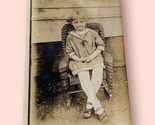 This product is an antique outdoor photo from the early 1900s featuring a concerned young girl sitting in a small rocking chair. The image is a portrait orientation, black and white, and measures 4 x 6 inches. It is an original cabinet card photograph on paper with a matte finish, making it a unique and one of a kind piece. The vintage photograph captures a moment in time with a charming subject and is a collectible item that would be a valuable addition to any photography enthusiast's collection.