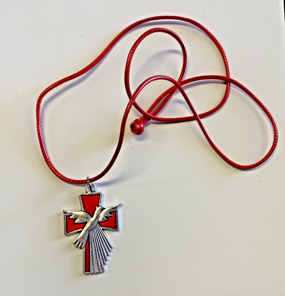 You are purchasing a very nice enamel cross with a dove on a red cord.