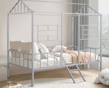 - Contemporary Silver Metal House Twin Bunk Bed w/ Angled Ladder