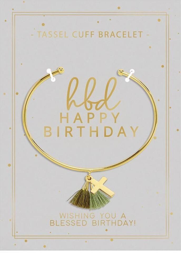 You are purchasing a small copper cuff bracelet with green tassels and a cross charm. It's wrapped for the special ocassion of a birthday. This is perfect to insert in a birthday card, or place on a gift as an additional token/gift.