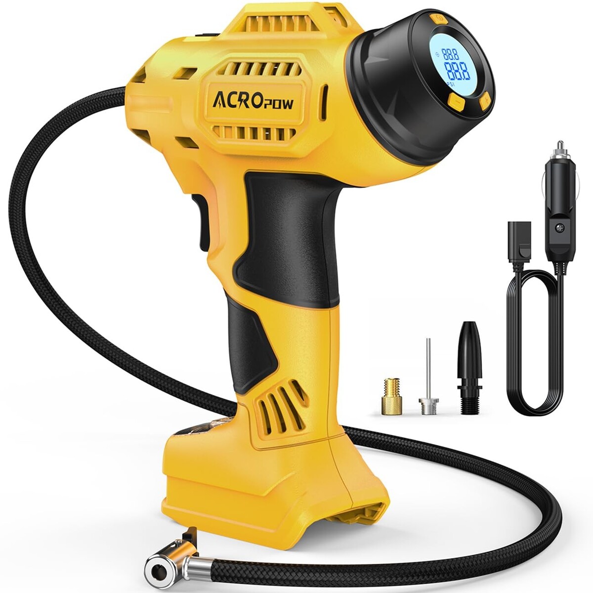 ?MULTIPLE PURPOSE?EASY TO USE? This handheld cordless air compressor with Bicycle valve adapter, ball needle adapter, tapered adapter is applicable for Automotive, SUVs, cars, motors, bicycles, and basketball-size inflatable products. You'll have complete control over your tire pressure, and the battery powered tire inflator helps you maintain perfect levels for optimal performance and safety. Note: not suitable for large truck tires. The inflator works with Dewalt 20 V max battery platform