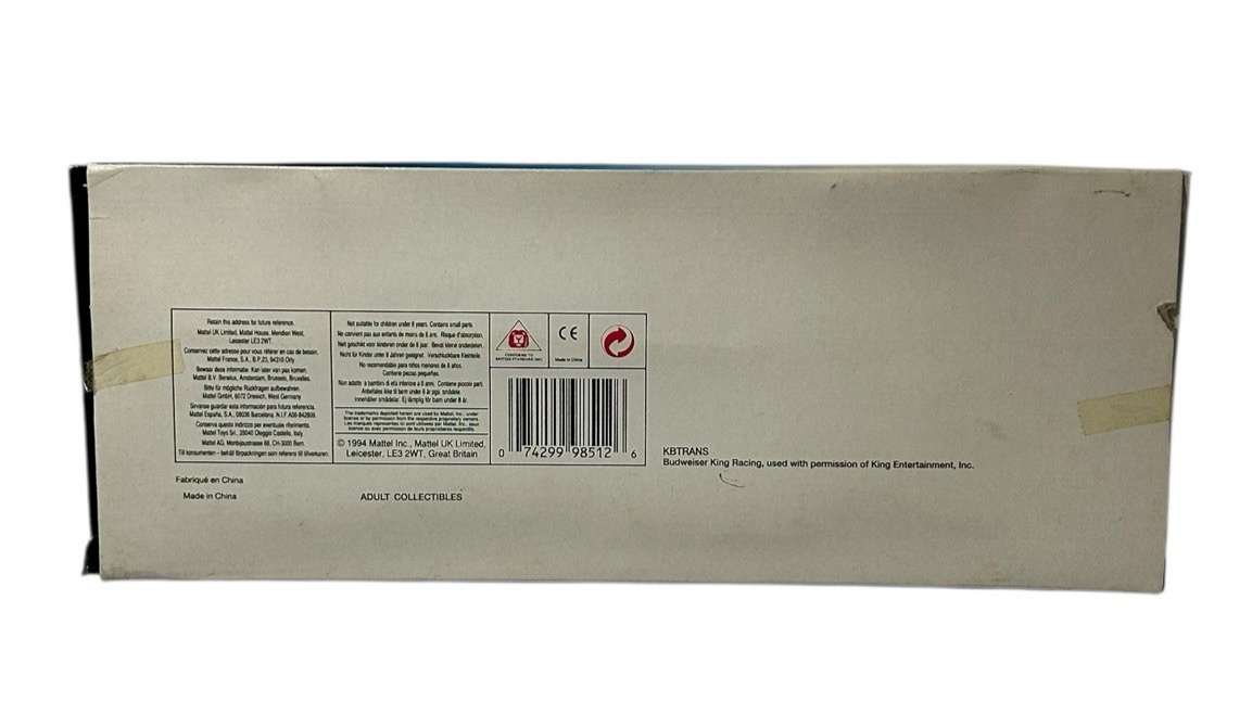 The product is a vintage Corgi diecast model from 1994, part of the NHRA Series featuring a Budweiser transporter and dragster driven by Kenny Bernstein. The multi-colored vehicle is made of diecast material and is recommended for adult collectors. This collectible item is a unique addition to any toy or diecast vehicle collection, showcasing detailed craftsmanship and historical significance in the world of NHRA drag racing.