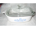 CorningWare is timeless. This pattern Blue Cornflower debuted in 1957. The graphic is bright and the surface of casserole is shiny. Pristine condition. The original clear glass lid is included. The maker's mark on the bottom instructs for range and microwave. There is no trademark symbol so this piece dates pre-1960's. Measures 8.5" rounded square X 2" deep. Blue Cornflower remains a staple of CorningWare collections.