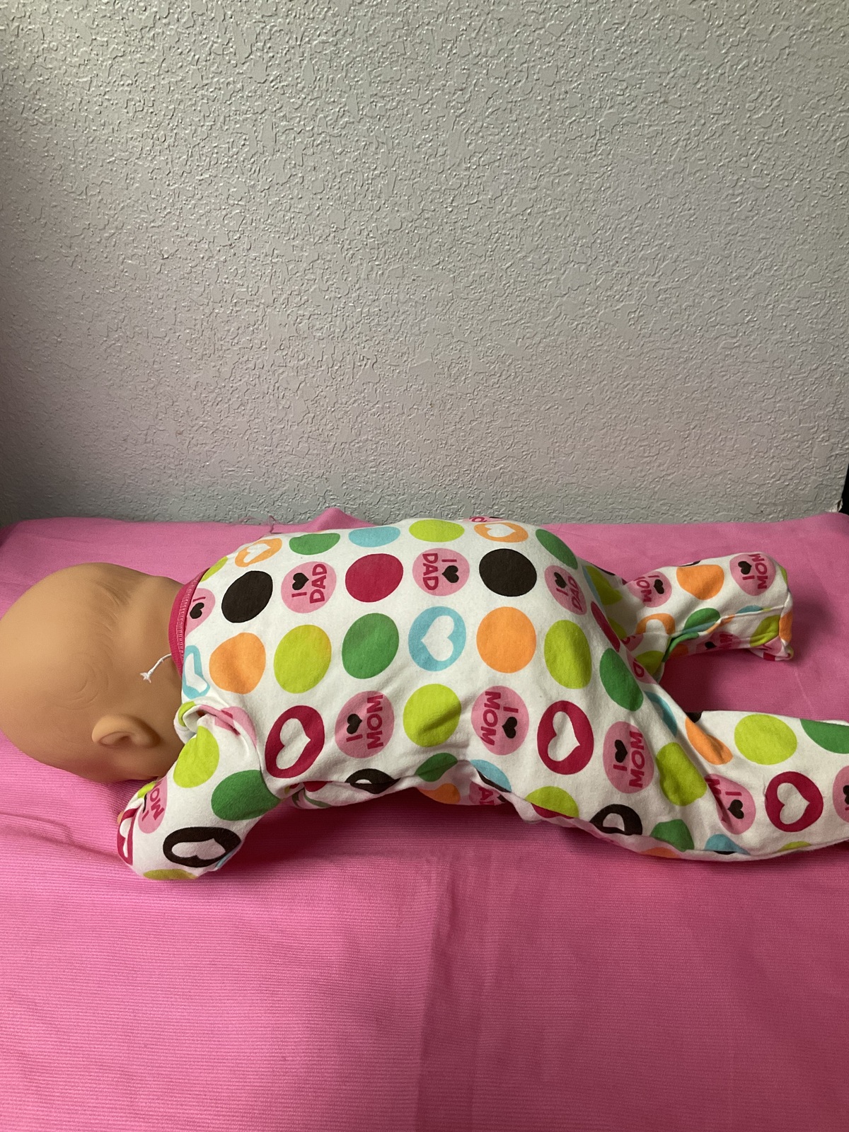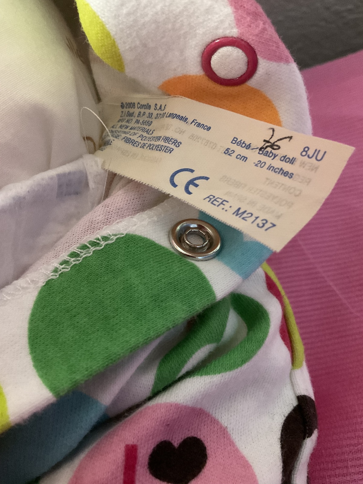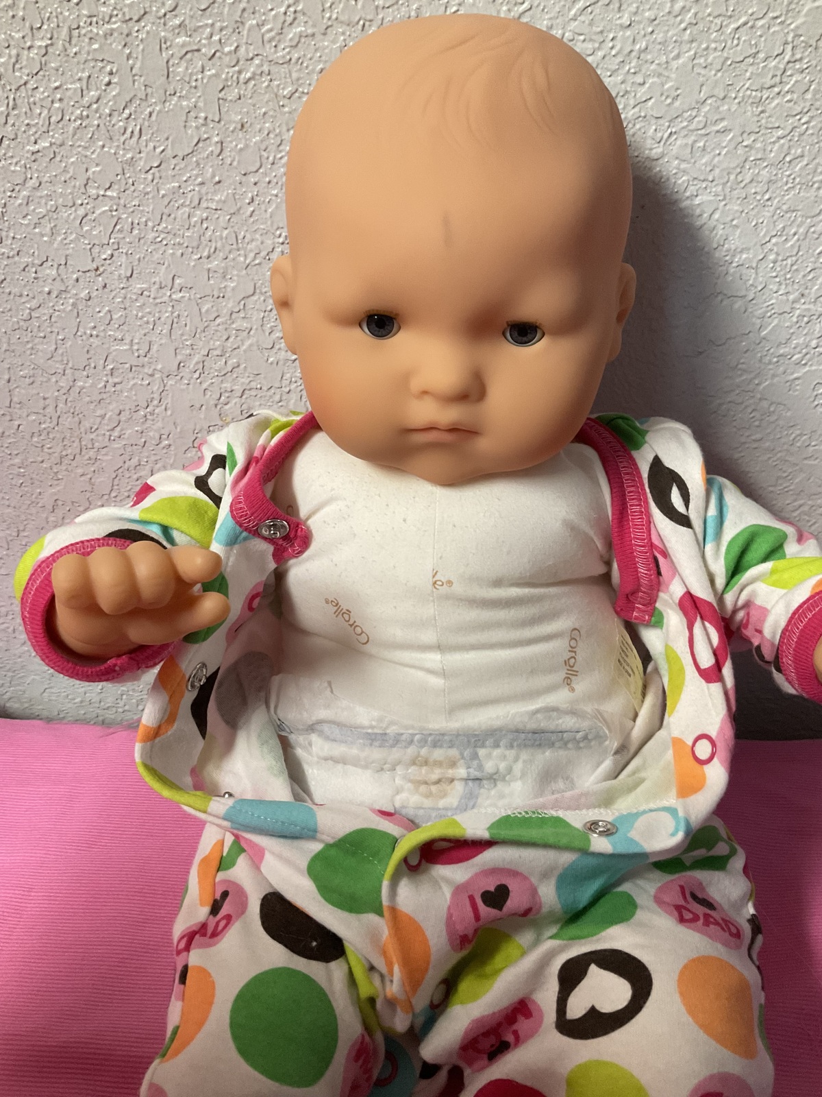 This little baby girl is absolutely adorable with her bald head and pretty gray eyes that open and close. She is a 20 inch lifelike or realistic baby doll made by Corolle in 2008. Corolle dolls have been around since 1979. The dolls are designed and manufactured in France. Corolle dolls are known for their realistic faces, soft bodies, and vanilla scent. She is in overall very good near vintage condition with one tiny flaw (which I did try to remove.) Please see all pics as they are part of the description. She is wearing a very cute sleeper that says I love mom and I love dad. She comes from my smoke free home although I am not her original owner. Sold AS IS.