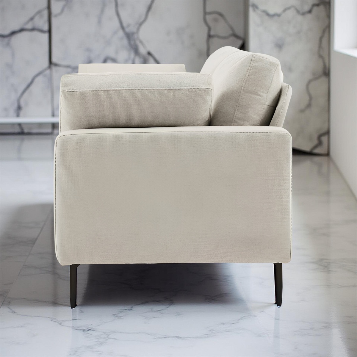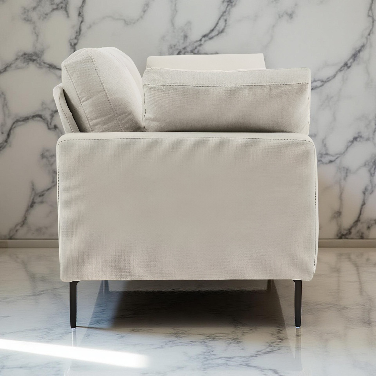Designed with thoughtful dimensions, the sofa offers a seat height of 17.7", back height of 17.7", and arm height of 22.8" for optimal support. The metal legs in black finish elevate the design while ensuring stability and strength, supporting a weight capacity of up to 700 lb. Easy to maintain, the upholstery can be spot-cleaned with a dry, solvent-based cleaner, and the frame can be wiped down with a damp cloth.