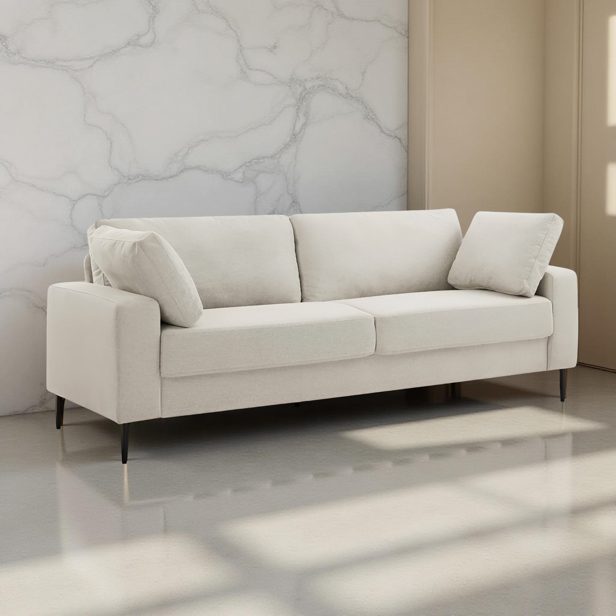 Bring mid-century elegance and modern comfort to your living space with the Corrigan Studio Jeses MINIMORE 84.3" Sofa. Upholstered in a luxurious off-white linen blend with velvet accents, this sofa features a clean, mid-century modern designwith square arms and a multiple-cushion seat for lasting comfort. Its versatile style complements a variety of interiors, from contemporary apartments to classic living rooms.