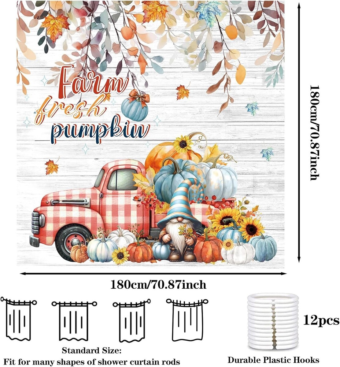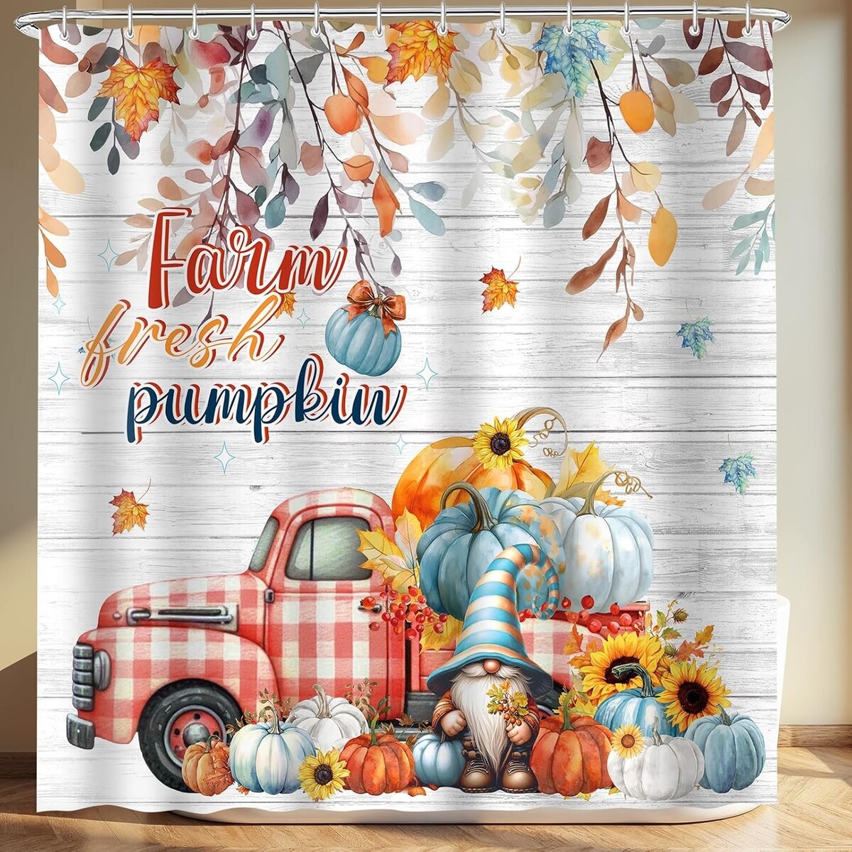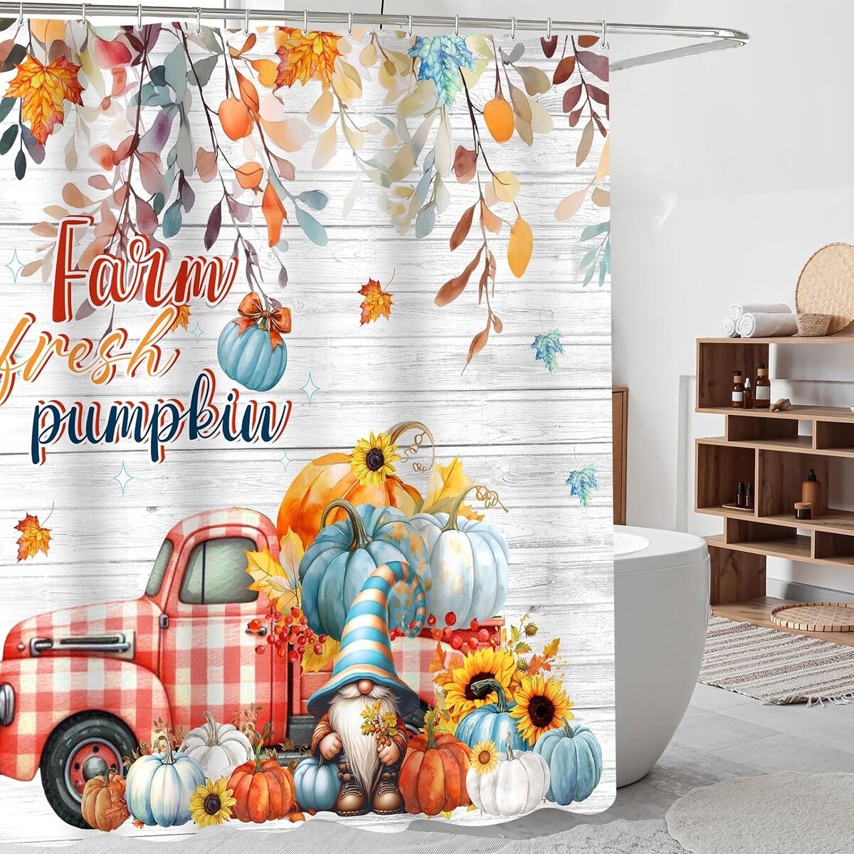 Cortina de ducha de otoño 71"W x 71"L (Pack de 1), naranja, impermeable con 12 ganchos, calabazas y hojas de arce, decoracion rústica para baño