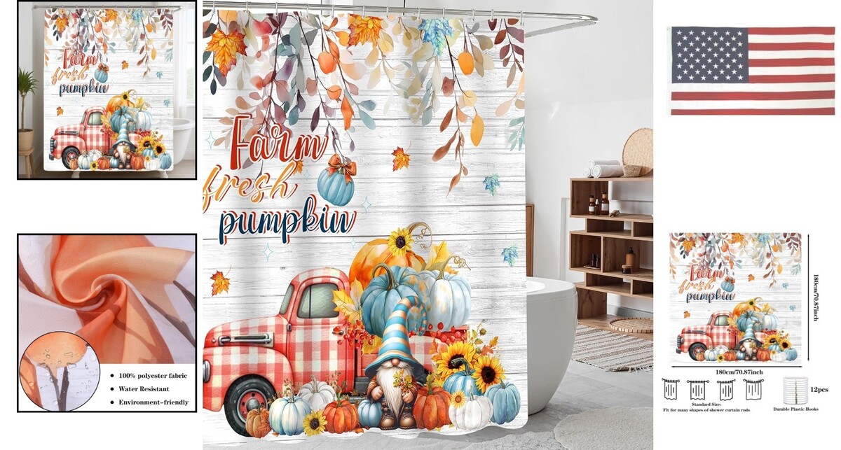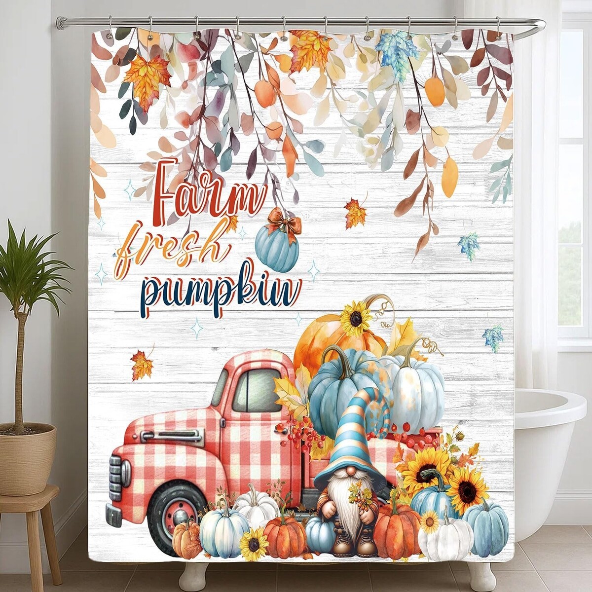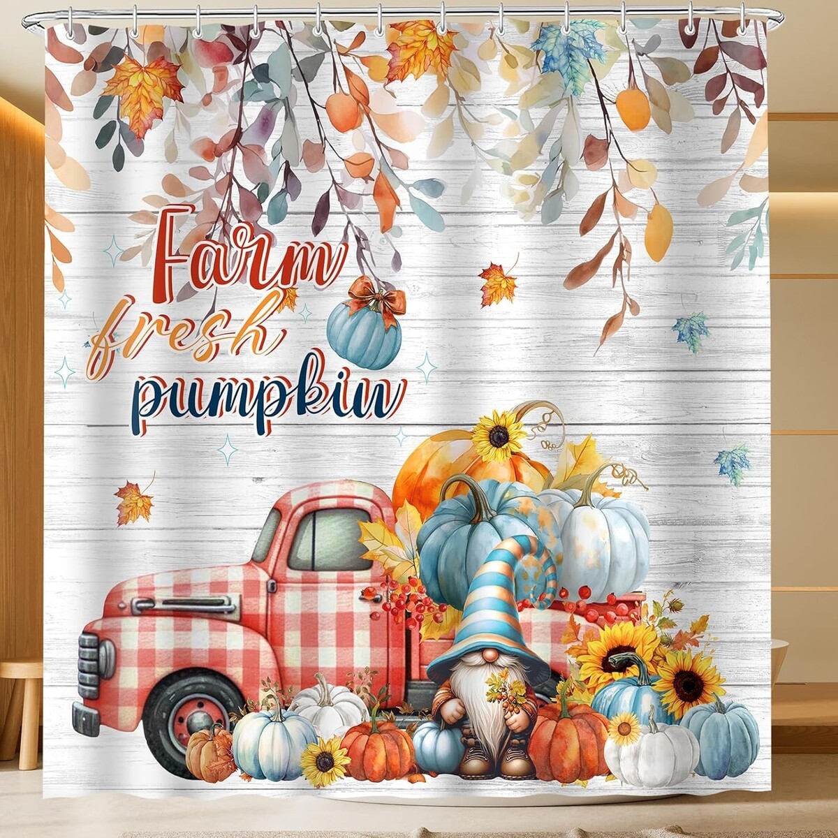 Cortina de ducha de otoño 71"W x 71"L (Pack de 1), naranja, impermeable con 12 ganchos, calabazas y hojas de arce, decoracion rústica para baño