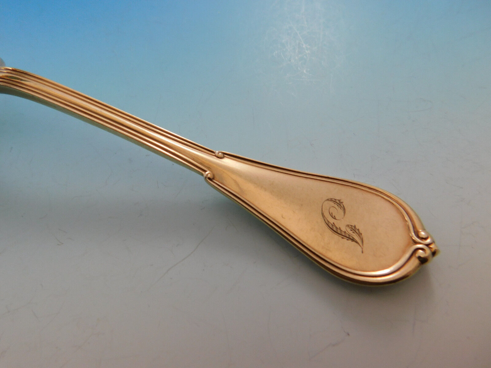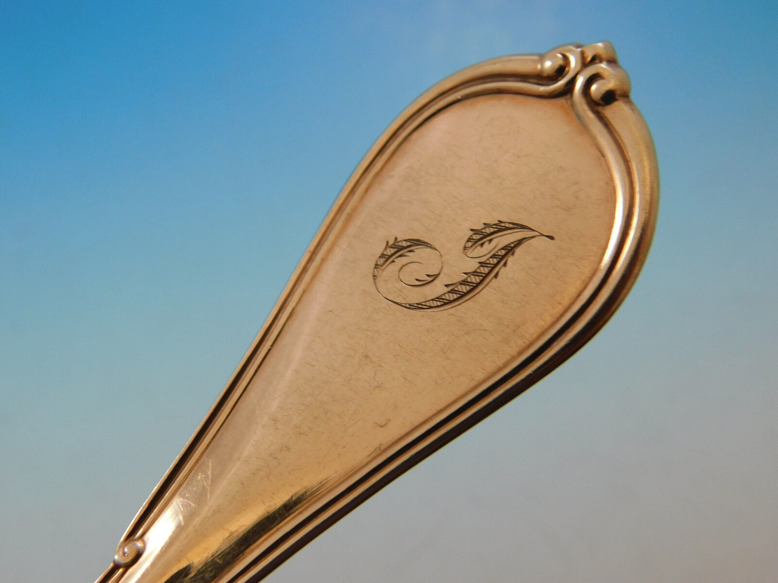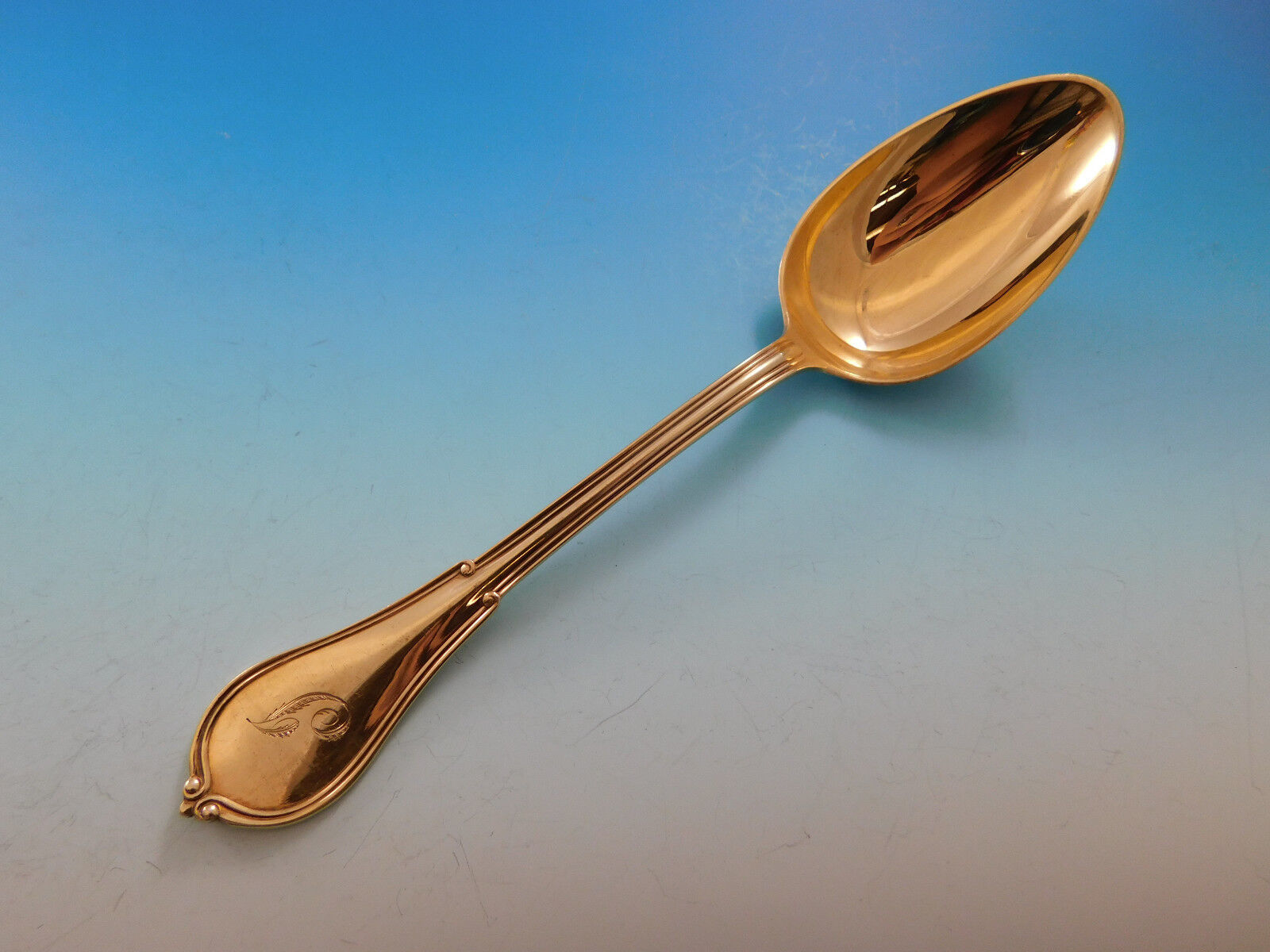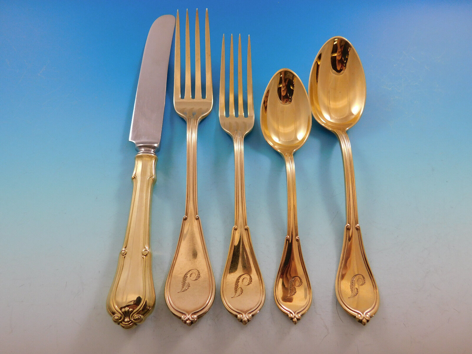 Excellent condition, with J monogram on all pieces except for the Dinner Knives, which are not mongrammed. The dinner knives are in a nearly identical pattern, Villa Norfolk Gold. This set will be lightly hand polished and sealed in individual plastic sleeves prior to shipping. Stunning!