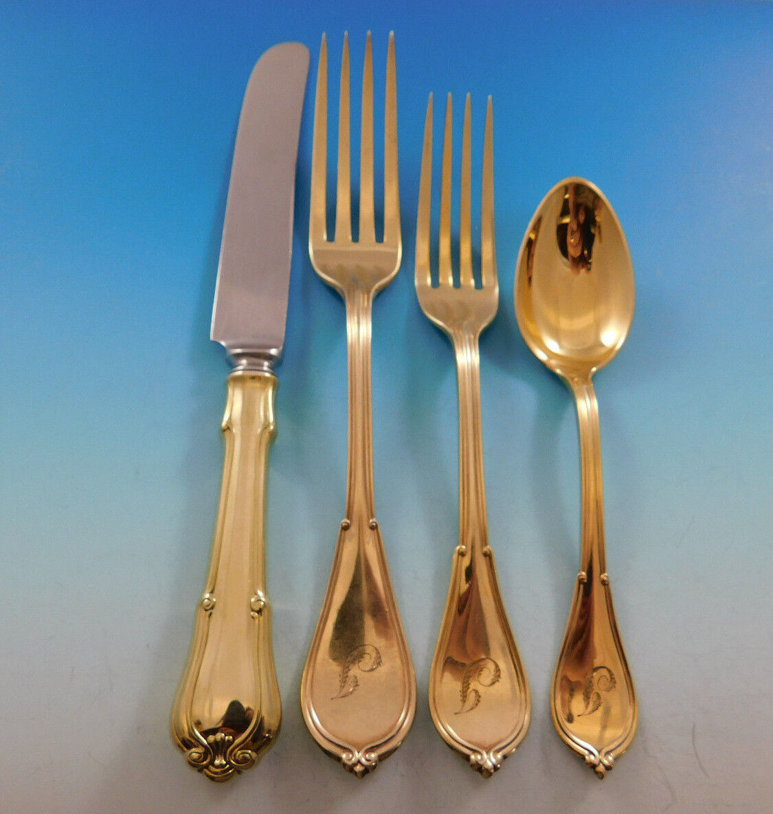 Dinner Size Cottage by Gorham vermeil (completely gold-washed) sterling silver Flatware set, 64 Pieces. This set includes: