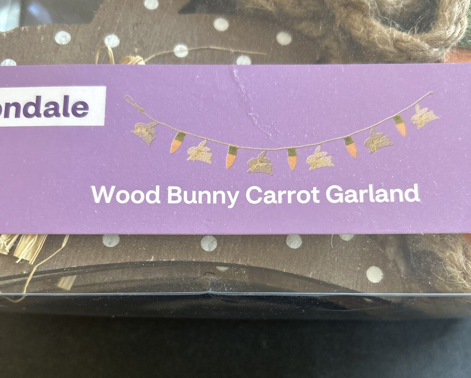 The product is a Cottondale 72 in Wood Bunny's Carrot's Garland Decoration, perfect for Easter. Made of wood in China, this garland features bunnies and carrots, measuring 72 inches in length and width. It is brand Thresold and comes in new condition in box (NIB). It is a festive and decorative item for holiday and seasonal decor in your home or garden.