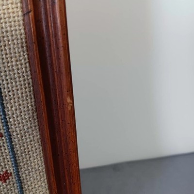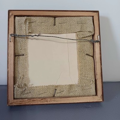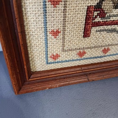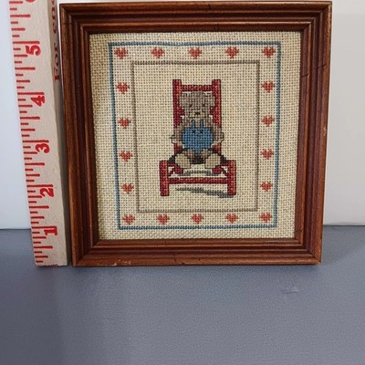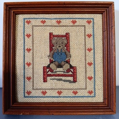 The product is a finished cross stitch piece from the 1980s featuring a bear sitting in a chair. The embroidery was done with cross stitch technique, and the piece is framed. This vintage piece would make a charming addition to any home decor or a perfect gift for someone who enjoys needlecrafts and embroidery. Good condition with normal wear and sizes is approximate.