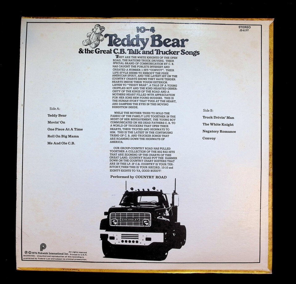 Country Road - 10-4 Teddy Bear The Great C.B. Talk And Trucker Songs LP released in the US in 1976 on Pickwick. This album features classic trucker anthems like "Teddy Bear," "Movin' On," and "Convoy."