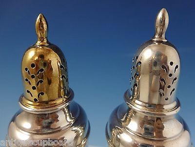 Courtship by International sterling silver salt and pepper shakers 2-piece set. The salt shaker has a gold washed top and the pieces are marked with #114-61. They measure 4 1/2" tall x 1 3/4" wide and together they weigh 3.8 ozt. (are weighted). This set is not monogrammed and is in excellent condition.
