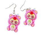 FUFU MONSTER TEDDY BODY w/Toothy Smile DANGLE Funky EARRINGS 3D Front / Flat-Back RESIN Charm Novelty Jewelry - PINK PARTY BEAR w/ STRAWBERRY BUNNY ANIMAL