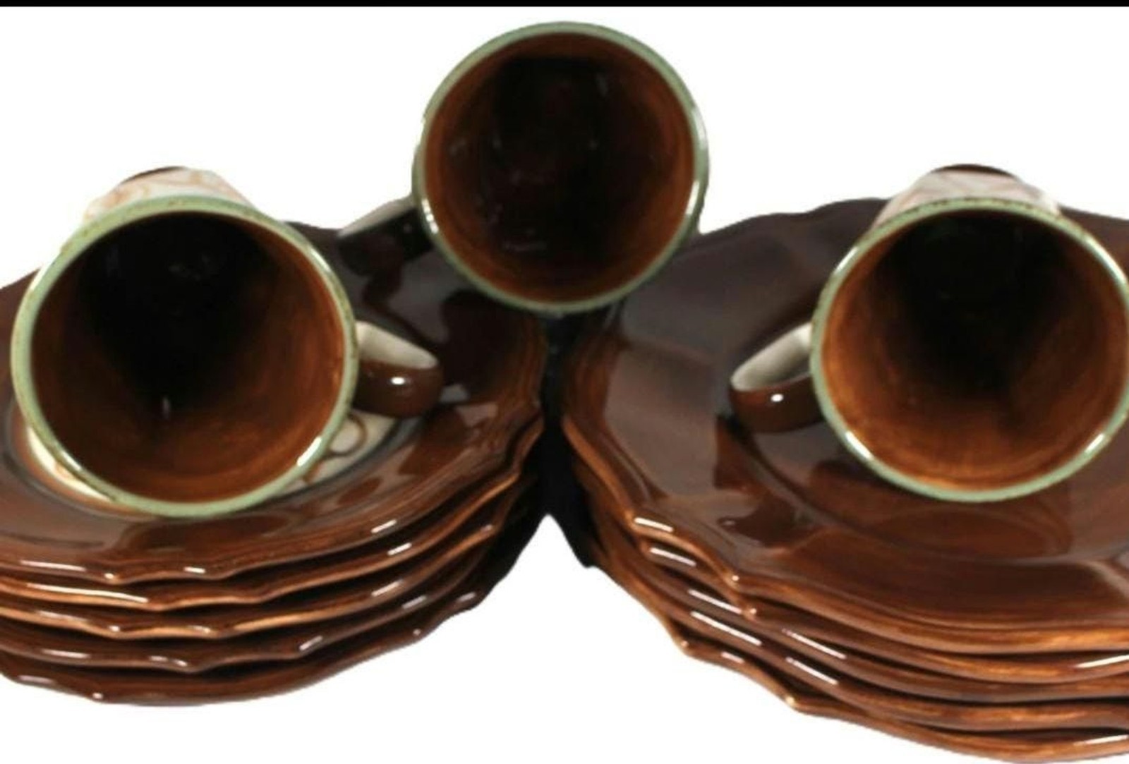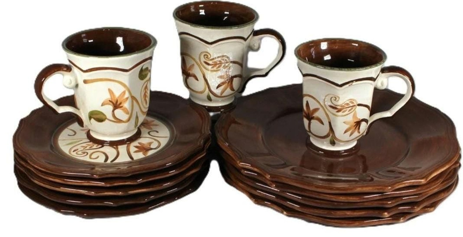 13 pc. set includes: Five 10 in. Rustic Brown Dinner Plates, 5 8 in" printed salad plates, and 3 Sixteen oz. Mugs.