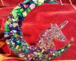 Gorgeous chunky glitters of purple, blues and greens fill this magical Unicorn who is perched on a crushed shell filled Crescent Moon. Nice simple piece, and mixed media fun!