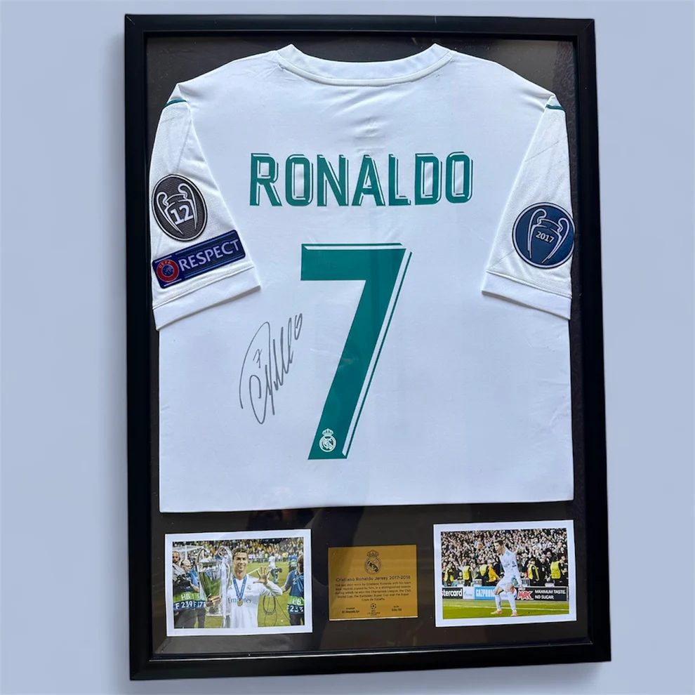 Own a piece of football greatness with this Cristiano Ronaldo framed Real Madrid jersey from the 2017/18 UEFA Champions League Final. Featuring a high-quality printed autograph, this collectible is designed to look just like an original signed shirt—offered at a very affordable price compared to authentic hand-signed versions.