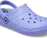 Crocs Toddler and Kids Classic Lined Clog in Digital Violet, size 10C US, features faux fur lining for added warmth. These unisex shoes in a purple color with a clog style are part of the classic Crocs line, offering a standard shoe width. Suitable for kids, these Crocs provide comfort and style for everyday wear.