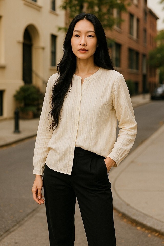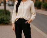 This blouse offers a blend of comfort and style with its cotton-rayon fabric and gold accents. Ideal for professional or casual environments.