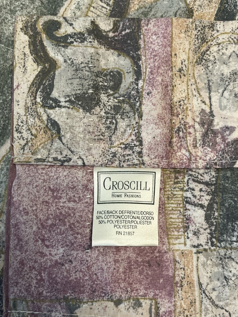 Croscill Home Fashions tapestry-style window valance featuring an elegant multicolor pattern with muted greens, burgundy, beige, and charcoal tones. Made from a medium-weight cotton/polyester blend with a textured woven feel. Classic Croscill quality and perfect for traditional, vintage, or eclectic decor.