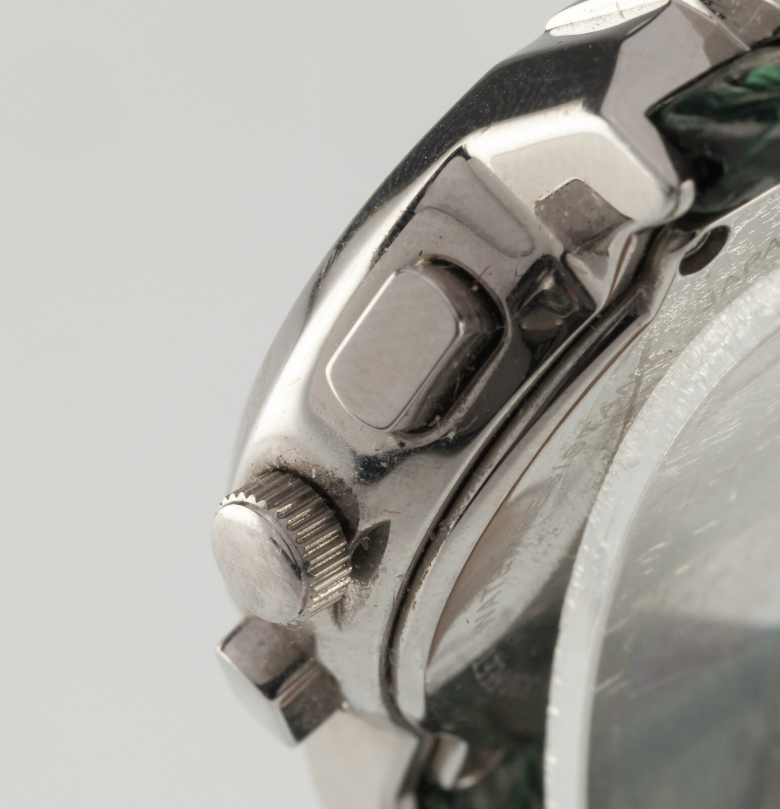 Green guilloche dial w/ mother-of-pearl chronograph dials and date feature at 4:00