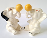 Set of two vintage Art Deco style performing circus elephants balancing a yellow ball upon their trunks. This matching pair of figurines are hand-painted, crafted of ceramic pottery, and feature a semi-matte gloss as a finishing touch. Please note that one of the elephants has a glossier finish than the other. The difference is most prevalent when focusing on the yellow ball ornaments being balanced on the trunks.