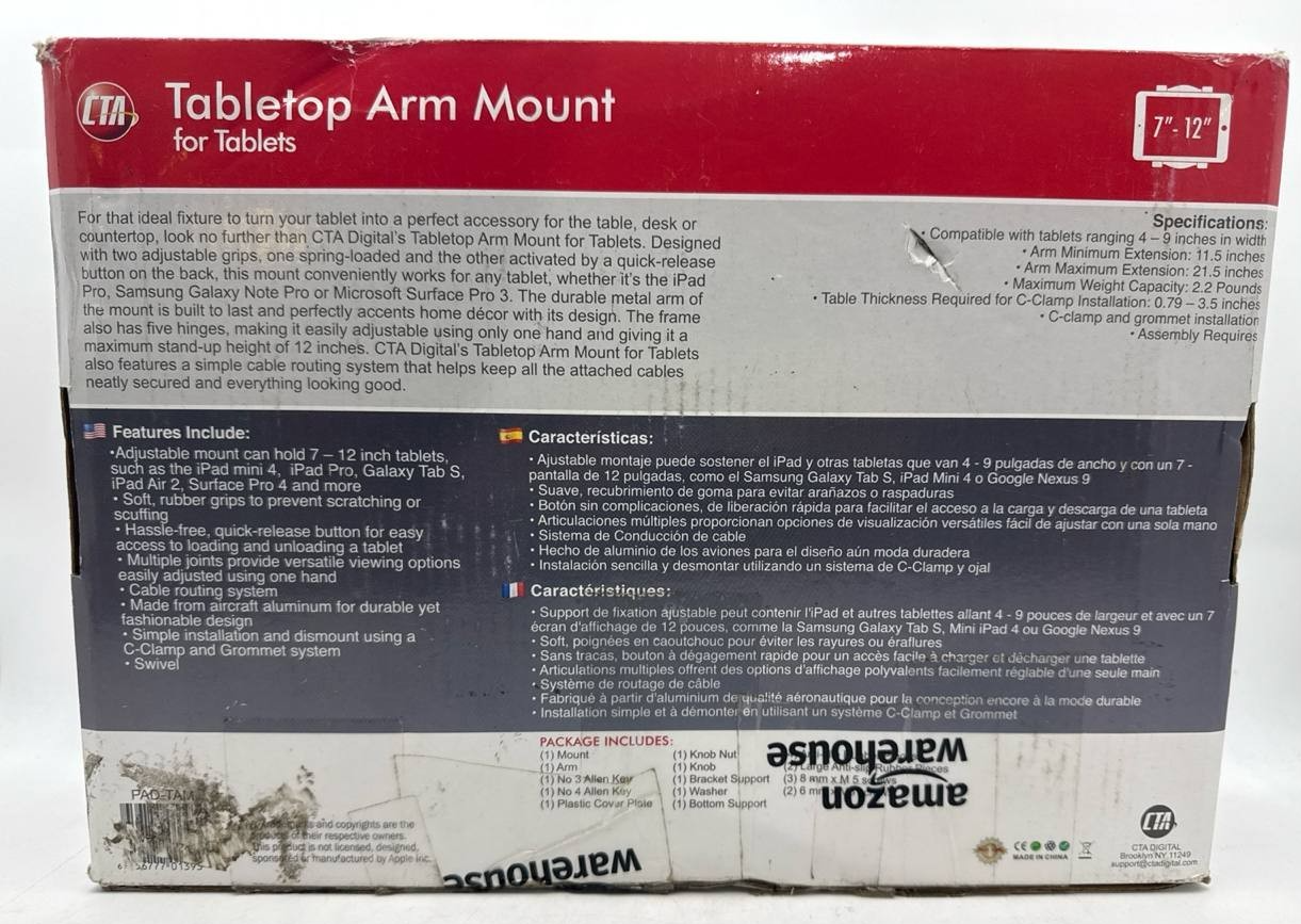 Item includes: Please note: This item includes 1 CTA Digital PAD-TAM Tabletop Arm Mount for 7?12" Tablets Only ? As Pictured. No other accessories are included.