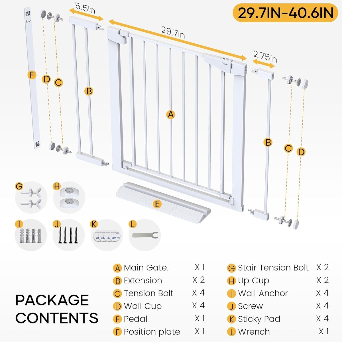 Fit Any Space, Secure Any Area: Our gate fits openings from 29.7" to 40.6" ? Extensions Included, which is ideal for standard U.S. doorways (30?36"), kitchen entrances, hallways (up to 40.6"), and most stairway openings.