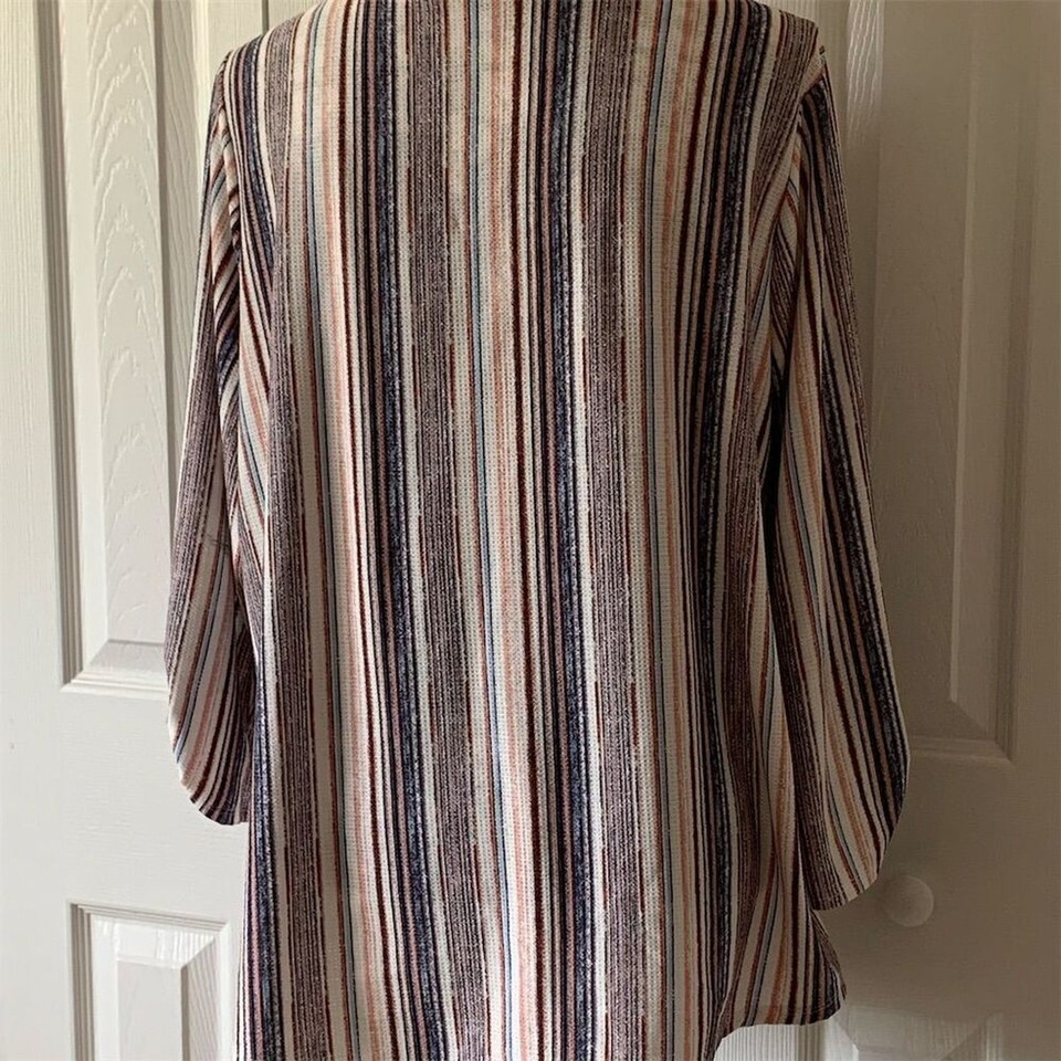 This Cure blouse in size XL features a multicolor striped pattern and is designed for women. Made from a blend of polyester and spandex, it offers a comfortable stretch fit. The blouse has a round neckline and 3/4 sleeves, making it suitable for casual spring occasions. It is machine washable and manufactured in China. The item is pre-owned.