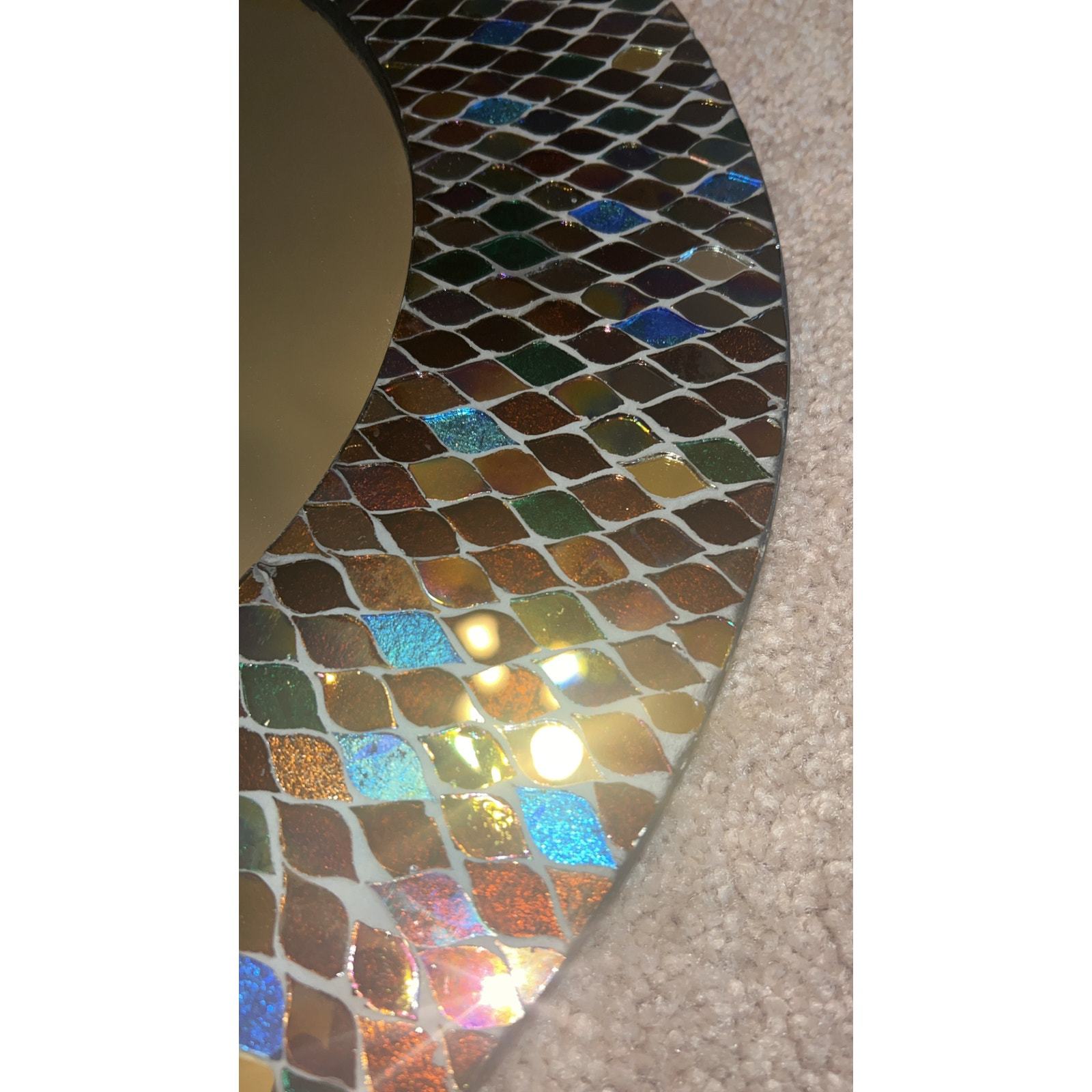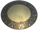 Mosaic glass decoration (or similar, not 100%) with inlaid glass mirror 13" diameter. Entire mirror (frame) is 20" diameter. Beautiful, eye catching piece from Curio Crafts India, an upscale home decor curio with orders from India. This piece is from 2023, brand new without original packaging.