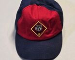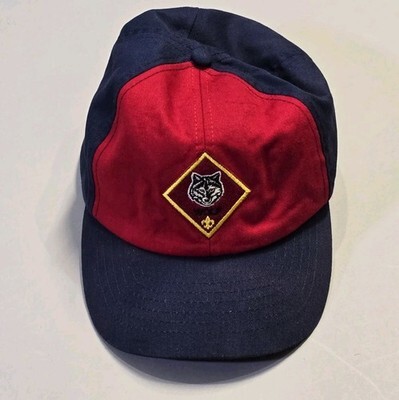 Please note name written on tag on the inside. The product is a baseball-style hat cap designed as part of the uniform for Cub Scout Wolf Rank members in the Boy Scouts organization. The cap is currently in style and includes the necessary size options for a comfortable fit. This item would be ideal for collectors or individuals looking to complete their Boy Scouts uniform with a realistic and authentic piece.