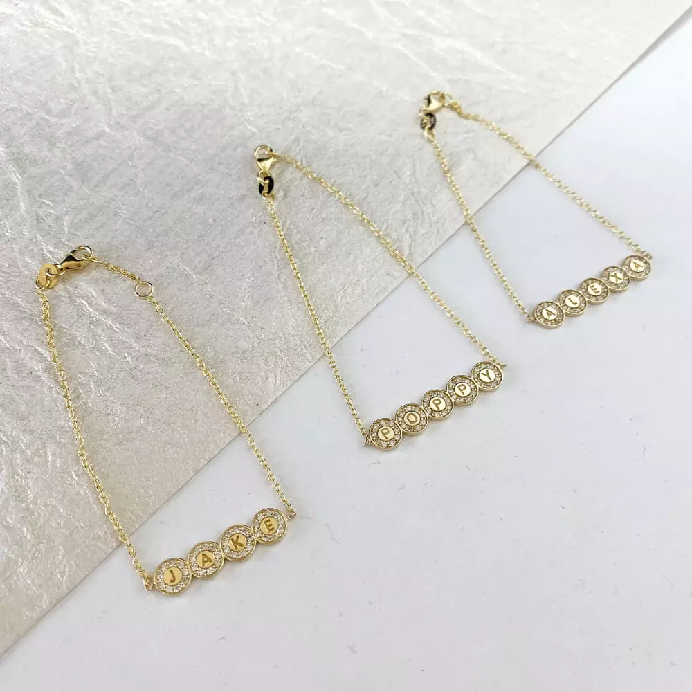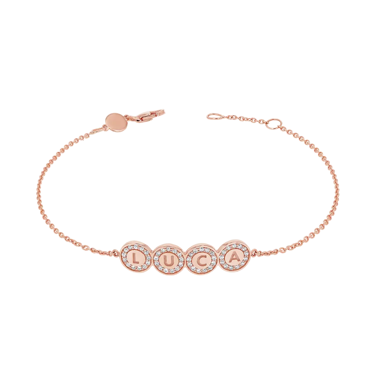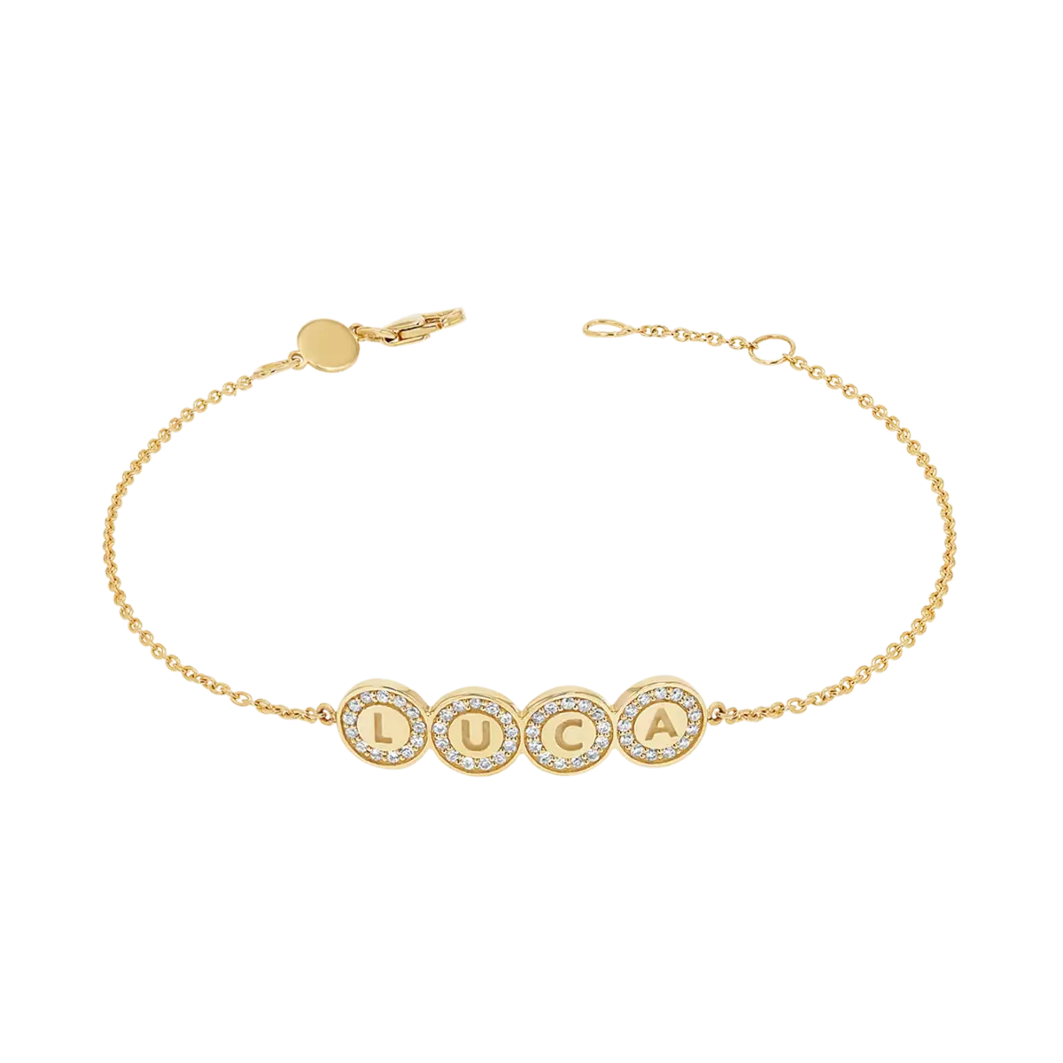The handcrafted 14k Gold Custom Diamond Bubble Bracelet is made in solid 14K gold. Each letter of your personalized engraving is surrounded by beautiful VS quality natural diamonds.