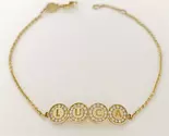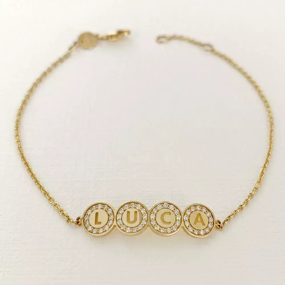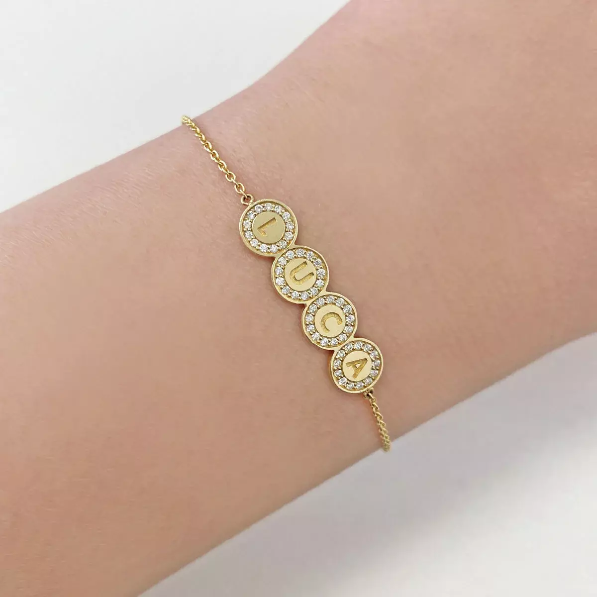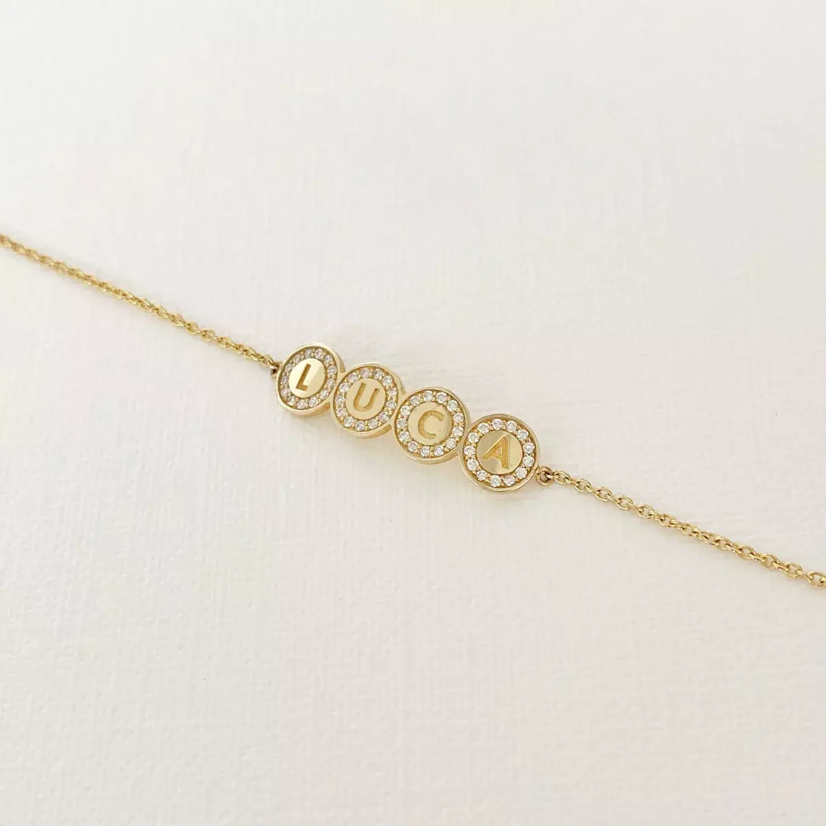 The handcrafted 14k Gold Custom Diamond Bubble Bracelet is made in solid 14K gold. Each letter of your personalized engraving is surrounded by beautiful VS quality natural diamonds.