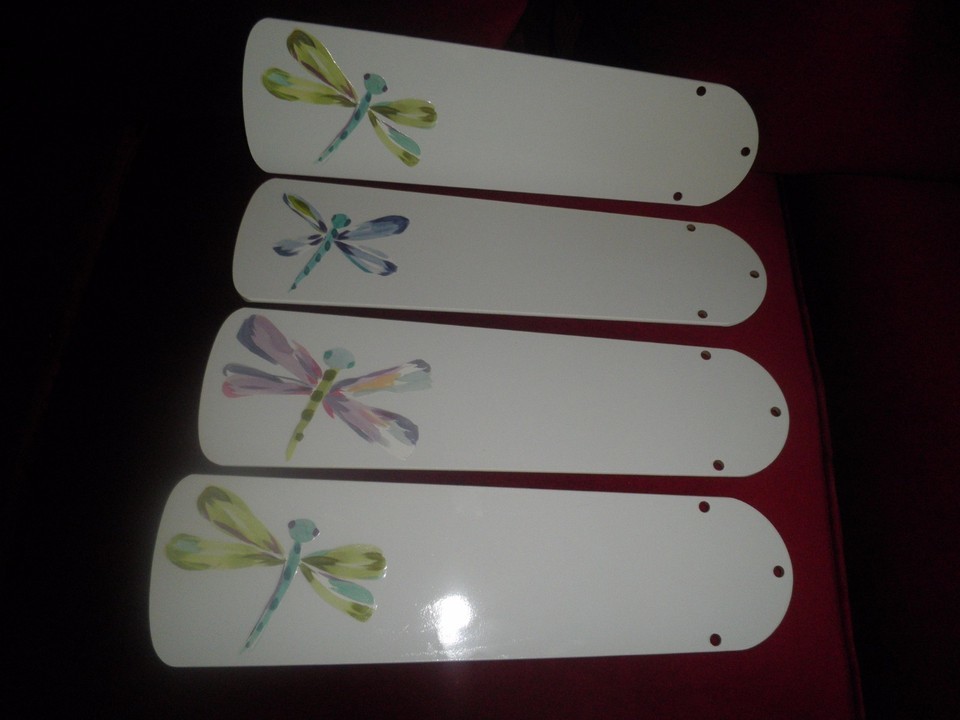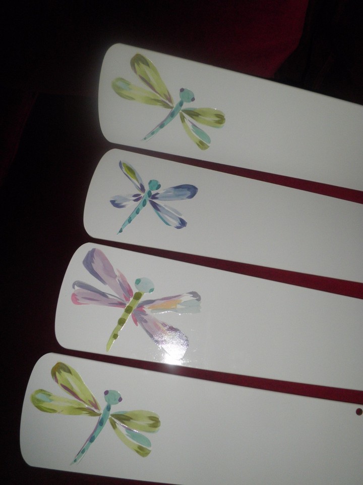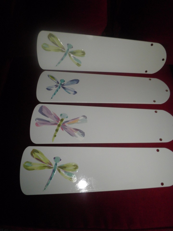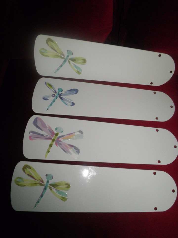 Only the blades have been removed to be custom handcrafted with soft lavendar, blue, green and white dragon flies. The graphics have been applied to the blades and then sealed with a gloss polyacrylic to protect the finish.