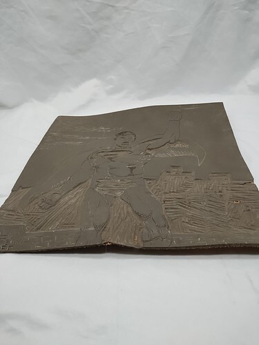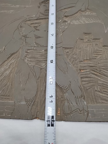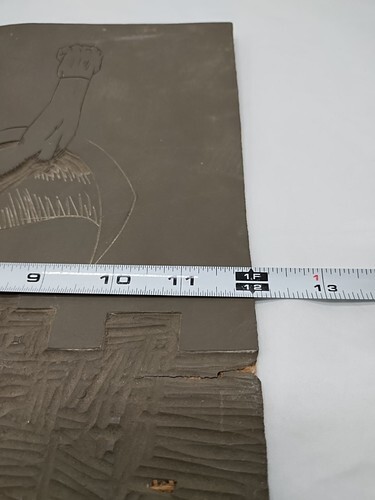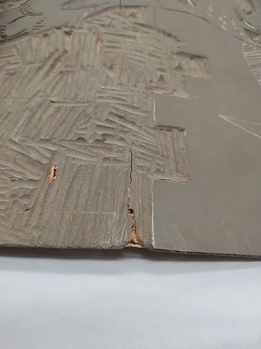 It looks like the art was carved into some kind of rubber material with some weaved base backing. There's some damage on the right side, see pictures please.