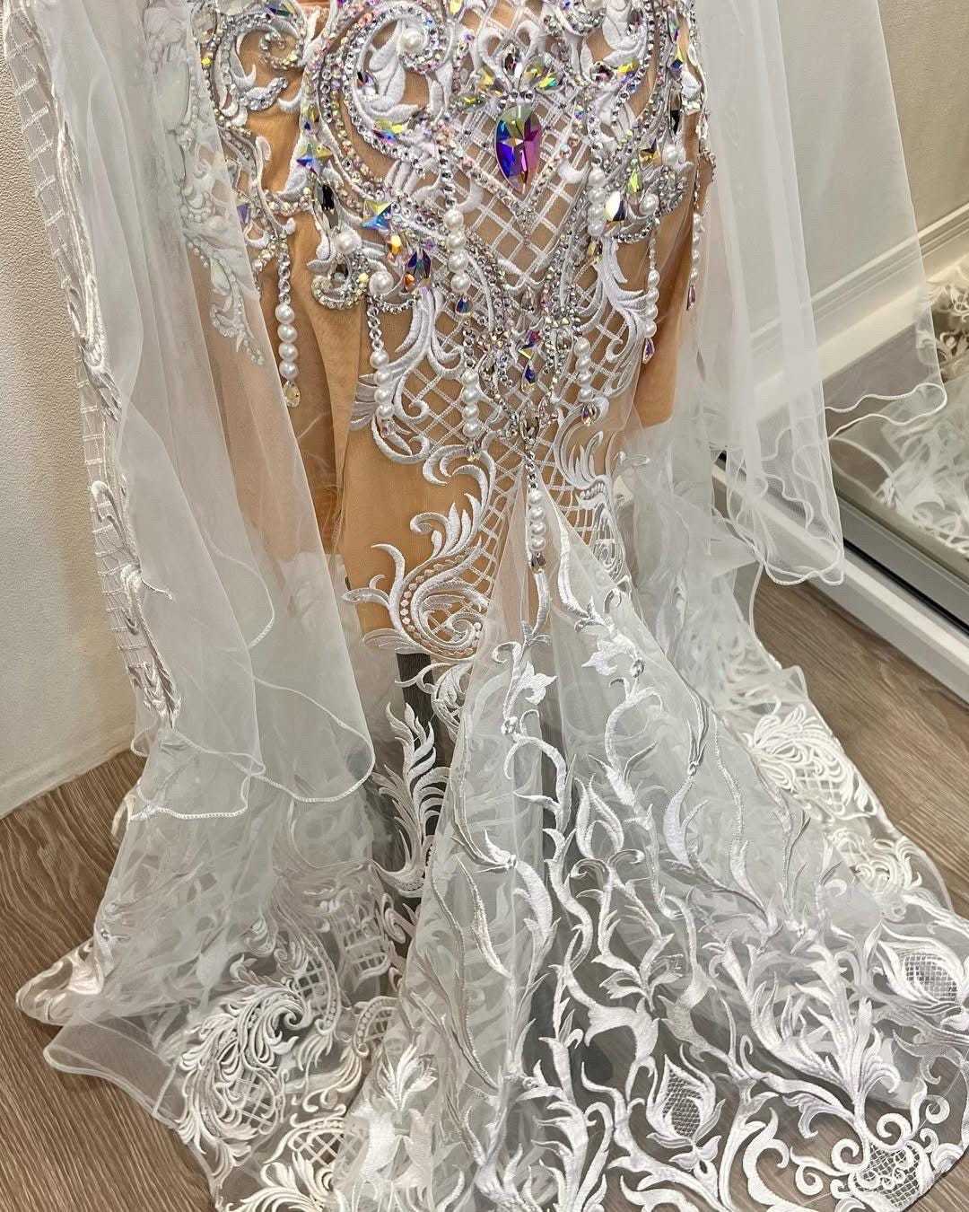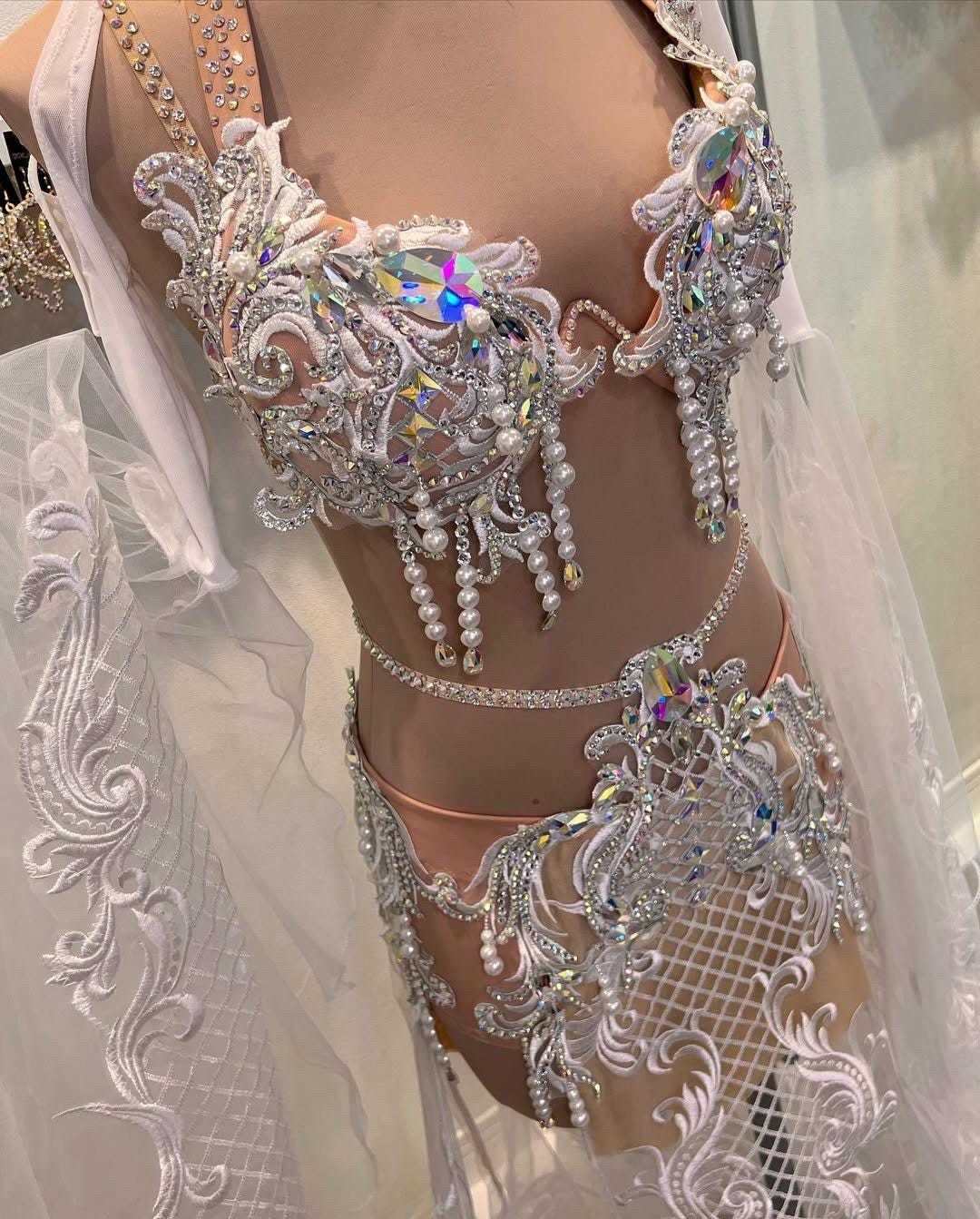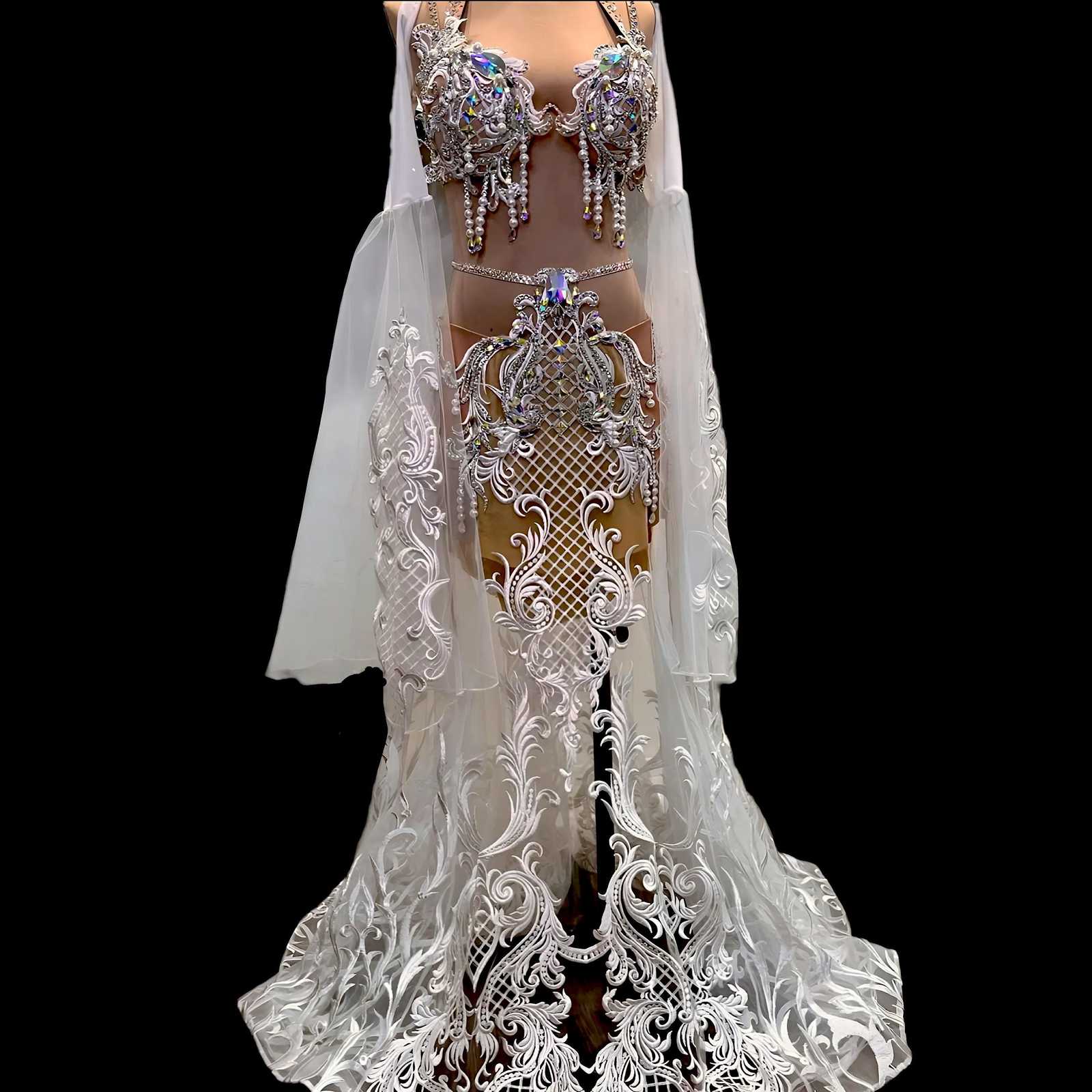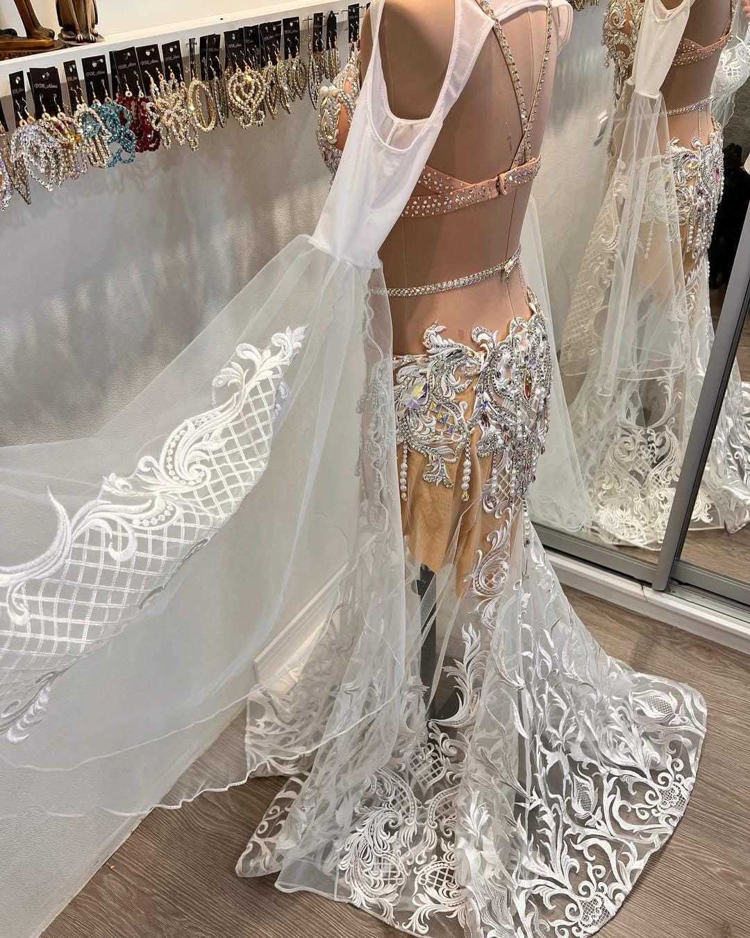 - Custom White Lace Belly Dance Dress: Rhinestone Festival Performance Costume