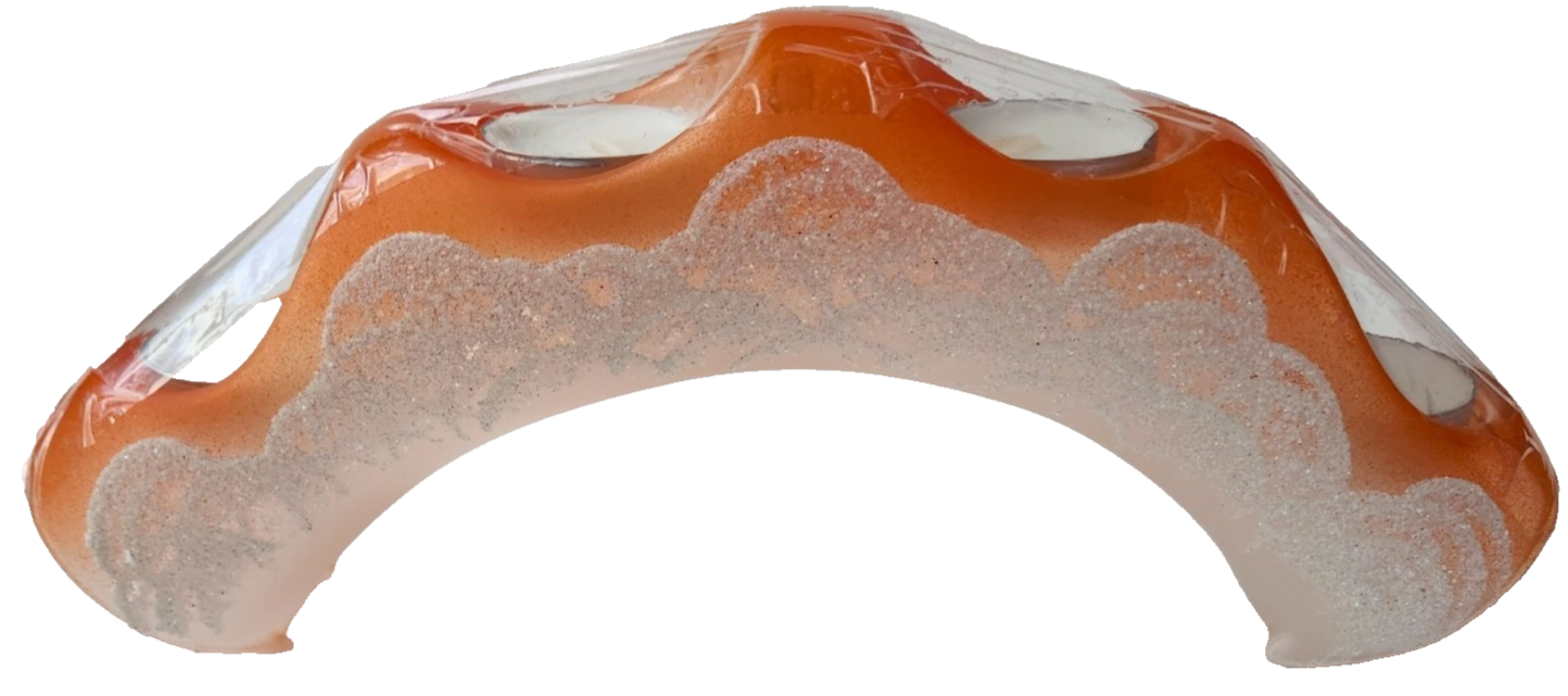 Czech glass tea light holder featuring a vibrant orange hue and winter village design. The curved structure adds elegance, while glitter accents enhance its festive appeal. Perfect for creating a warm, cozy ambiance in home decor or holiday settings.Holds Four Tea Lights For Even Illumination Glitter Detailing Adds A Festive Touch Hand-Painted Winter Village Design